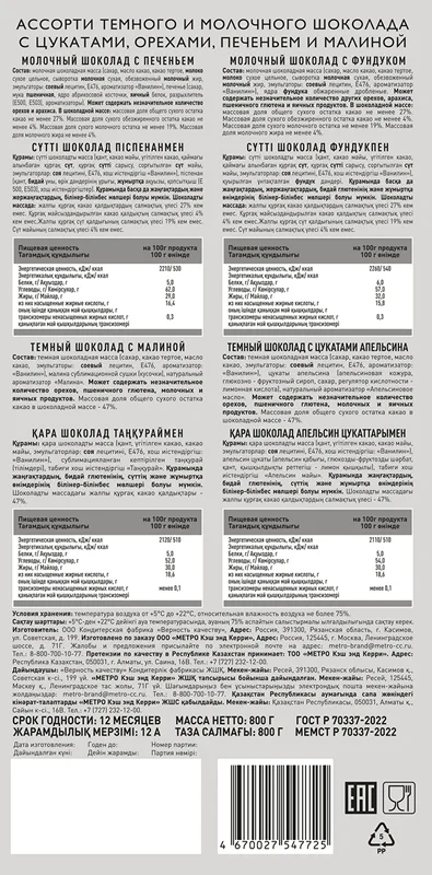 Rioba Шоколад Ассорти 4 вкуса, 800г – это один из вкусных и востребованных десертов в удобной упаковке. В состав шоколада входят природные антиоксиданты, а в процессе его изготовления не применяются красители, консерванты и другие неполезные добавки. Продукт способен предупредить и замедлить процесс старения клеток мозга, так как в его составе присутствует большое количество флавоноидов, участвующих в активности ферментов и скорости умственной деятельности. В составе шоколада присутствует большое количество какао, поэтому он способен благоприятно влиять на деятельность сердечно-сосудистой системы, понижать уровень холестерина. При создании продукта использована специальная рецептура.