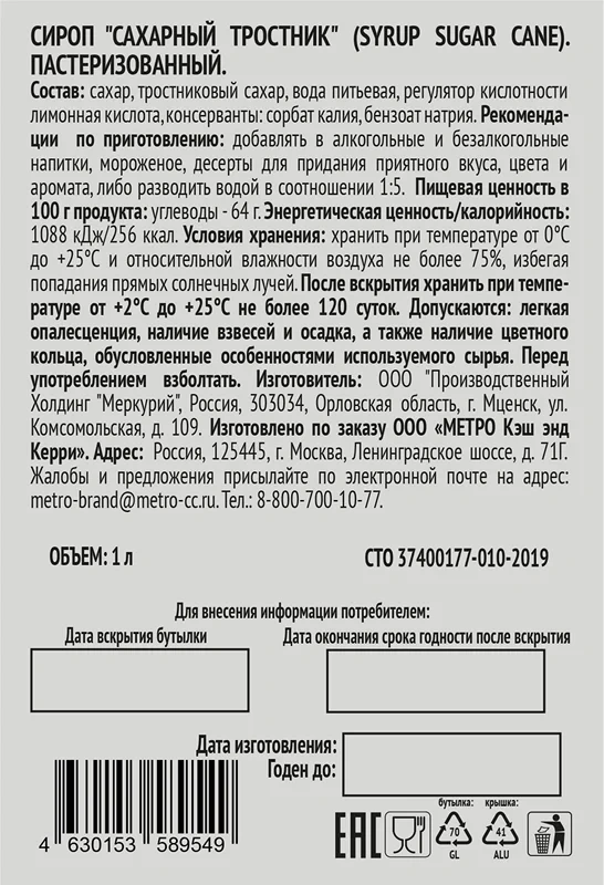 Натуральный сироп со вкусом тростникового сахара. Густой, ароматизированный. Изготовлен из натуральных ингредиентов. Идеально сочетается с кофе, барными и молочными коктейлями. Широко используется в кулинарии для украшения мороженого, тортов, пирожных. Применяется в качестве пропитки для коржей и выпечки. Подходит для вегетарианцев. При использовании сиропа для питья разбавлять водой в пропорции 1:8.