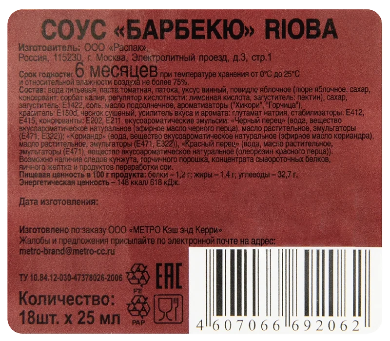Соус Rioba Барбекю, 25г х 18шт