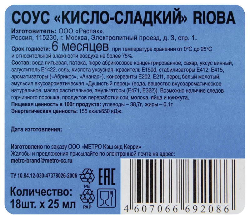Соус Rioba кисло-сладкий, 18х25г – прекрасное дополнение к блюдам из мяса и курицы. Продукт произведен на основе натуральных ингредиентов. В его состав вошла очищенная питьевая вода, пюре из отборных абрикосов, винный уксус и ароматные специи. Соус обладает насыщенным вкусом и ароматом. Продукт прекрасно дополнит собой такие закуски, как куриные наггетсы и картофель фри.