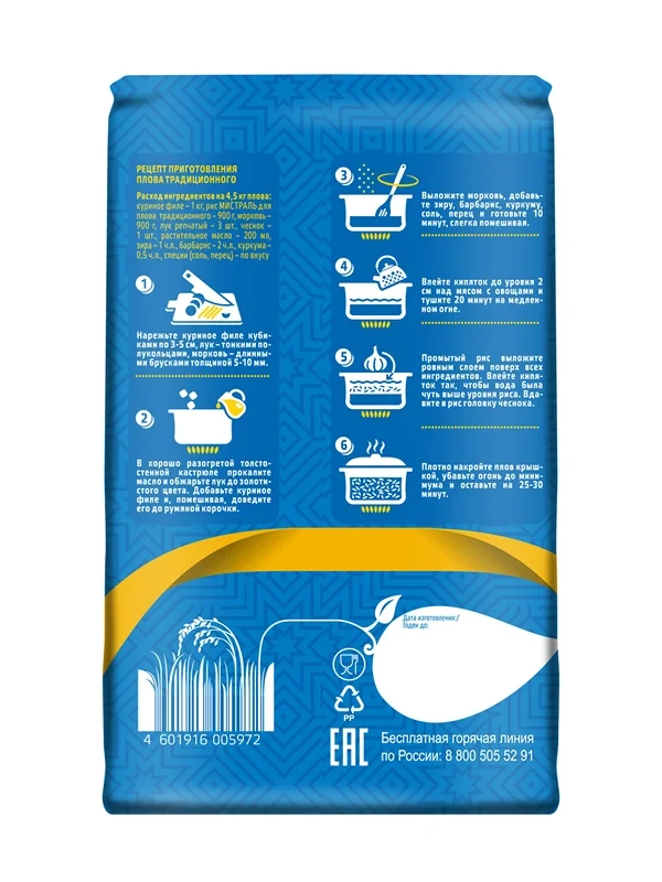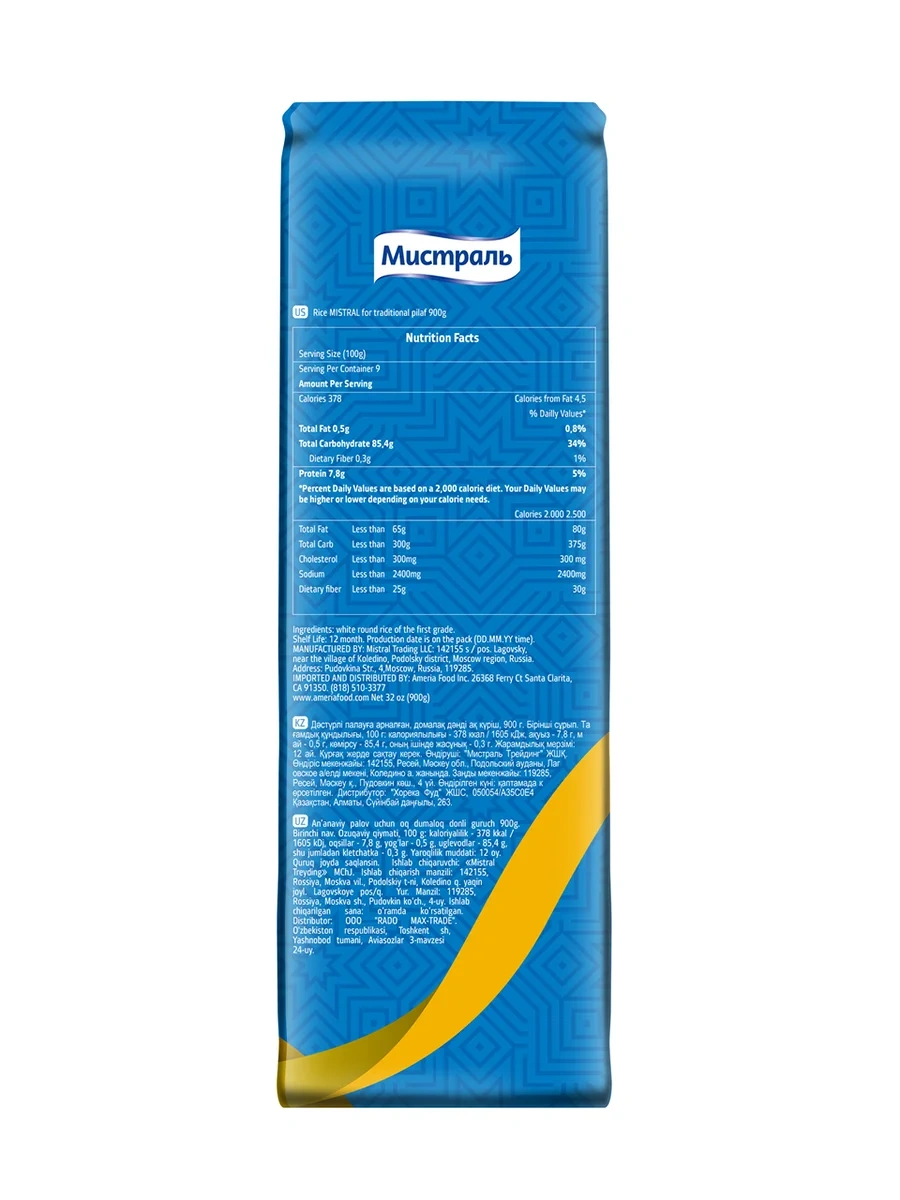 Рис Мистраль Кубань для плова белый круглозерный создан из экологически чистого сырья без использования синтетических усилителей вкуса и проходит тщательную очистку при производстве. Продукт предназначен для приготовления национальных блюд восточной кухни по традиционным рецептам и оптимально сочетается с различными видами мяса, растительными маслами и овощами. Варить крупу необходимо около 25 минут на медленном огне, пока зерна не впитают всю воду. В составе содержатся кальций, калий, натрий, благодаря которым нормализуется нервно-мышечная деятельность, укрепляется костная ткань, а витамины группы В улучшают клеточный метаболизм.