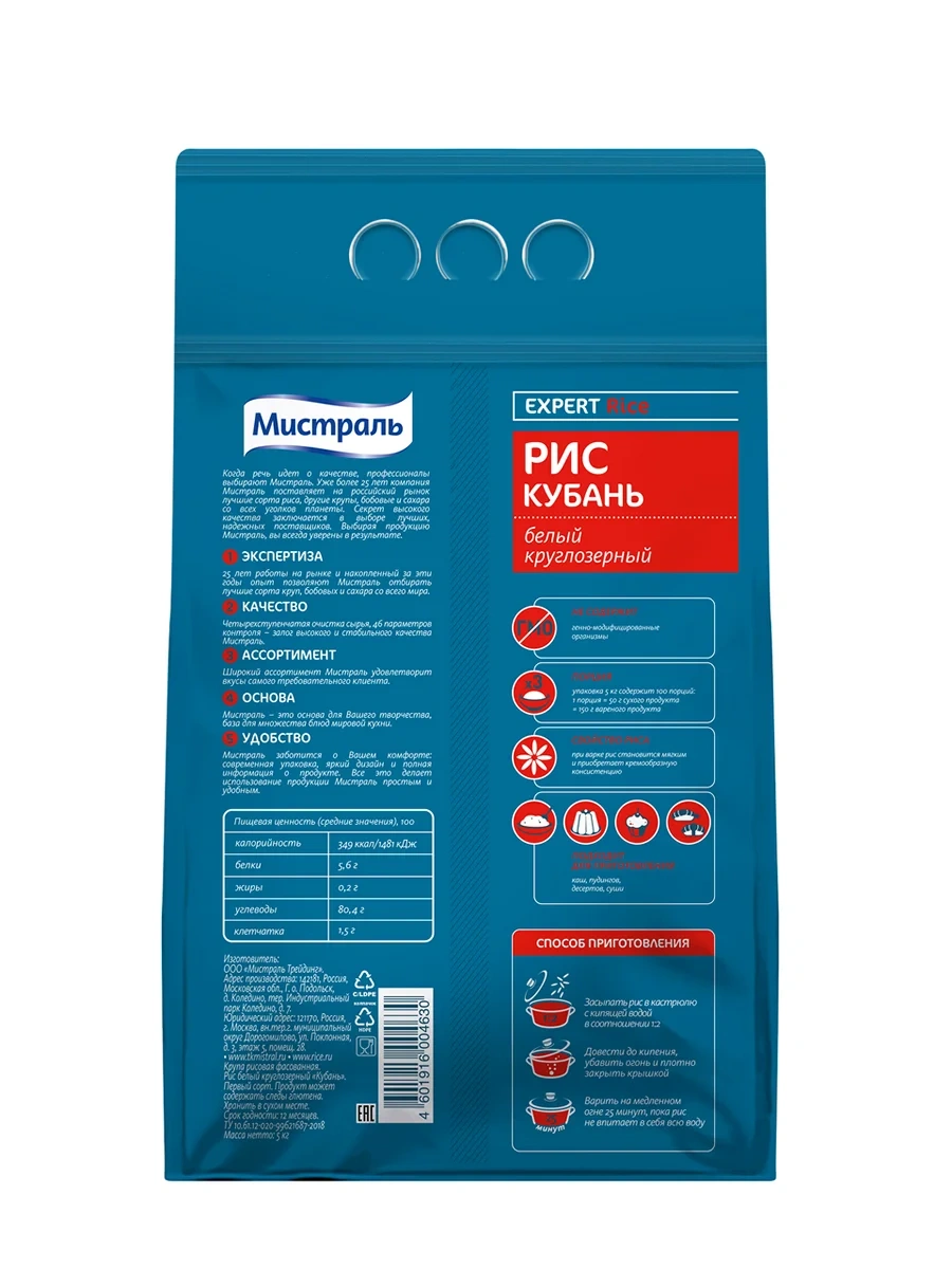 Рис Мистраль Кубань — это выращенные на южных российских полях злаки, прошедшие тщательный отбор, калибровку и подготовку, чтобы показать лучший результат в каждом блюде. Все зерна соответствуют одному стандартному размеру и обладают правильной формой, а многоступенчатая очистка избавляет их от любых нежелательных примесей и шелухи. Перед расфасовкой крупа хорошо промывается и пропаривается для лучшего хранения и быстрой варки. Кубанский рис традиционно получается рассыпчатым, обладает нежной фактурой и мягкими вкусовыми качествами. Благодаря отсутствию глютена в составе злака, он полностью гипоаллергенен и подходит для оздоровительных или очищающих диет. Круглозерный рис используется во многих блюдах кухонь и народов мира, а также является одним из ключевых компонентов сбалансированного питания и фитнес-диет. Богатый набор микро- и макроэлементов, витамины и клетчатка, содержащиеся в крупе, необходим организму взрослых и детей ежедневно.