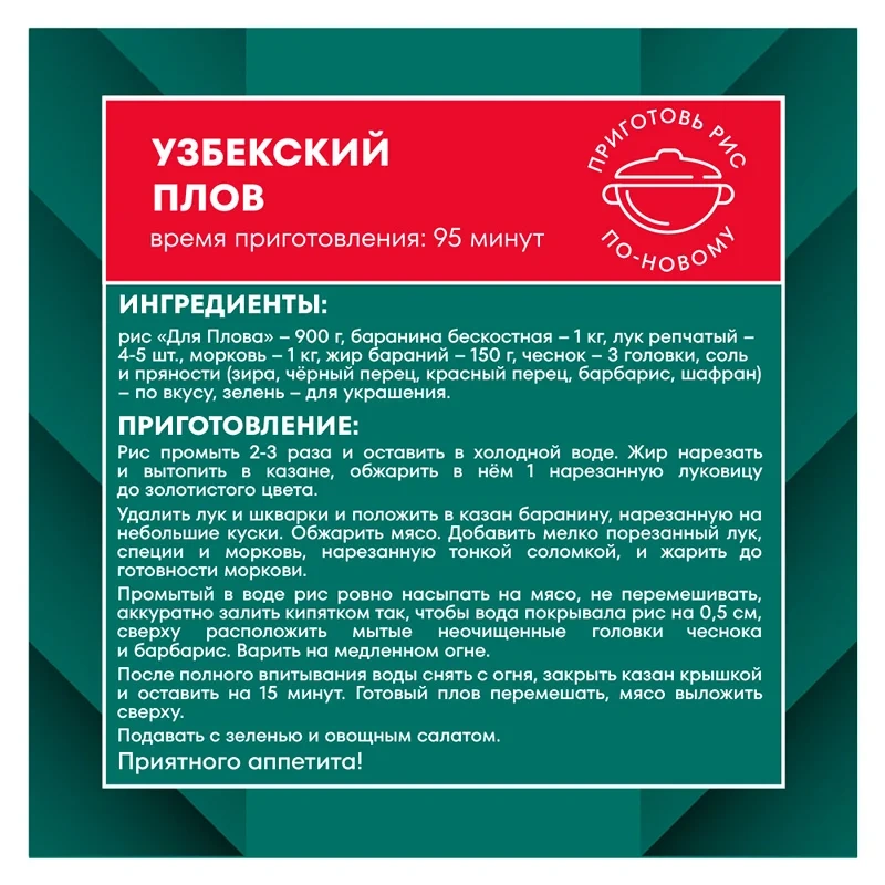 Известный с древних времен традиционный узбекский плов передает истинный характер национальной кухни, наполненной восточным колоритом. Рис Для плова — это среднезёрный сорт риса, крупные полупрозрачные зёрна которого сохраняют форму и рассыпчатость даже после варки. Идеален для приготовления по-настоящему вкусного и ароматного плова.