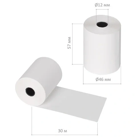 Cостоит из бумажной основы с нанесением на неё термочувствительного химического состава. Рулоны изготовлены на современном оборудовании, обеспечивающем ровную намотку и отсутствие бумажной пыли. Позволяют получить печать высокого качества и продлевают срок службы оргтехники. Чековая лента с наружным термослоем имеет ширину 57 мм и общую длину 30 м. Диаметр рулона - 46 мм, диаметр втулки - 12 мм. Плотность бумаги чековой ленты - 48 г/м2. Поставляется в термоусадочной пленке. 16 штук в комплекте.