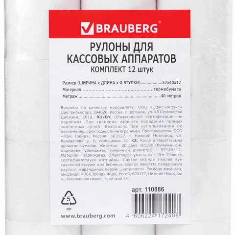 Ролик для касс Brauberg термо d=12мм, 57мм х 40м, 12шт