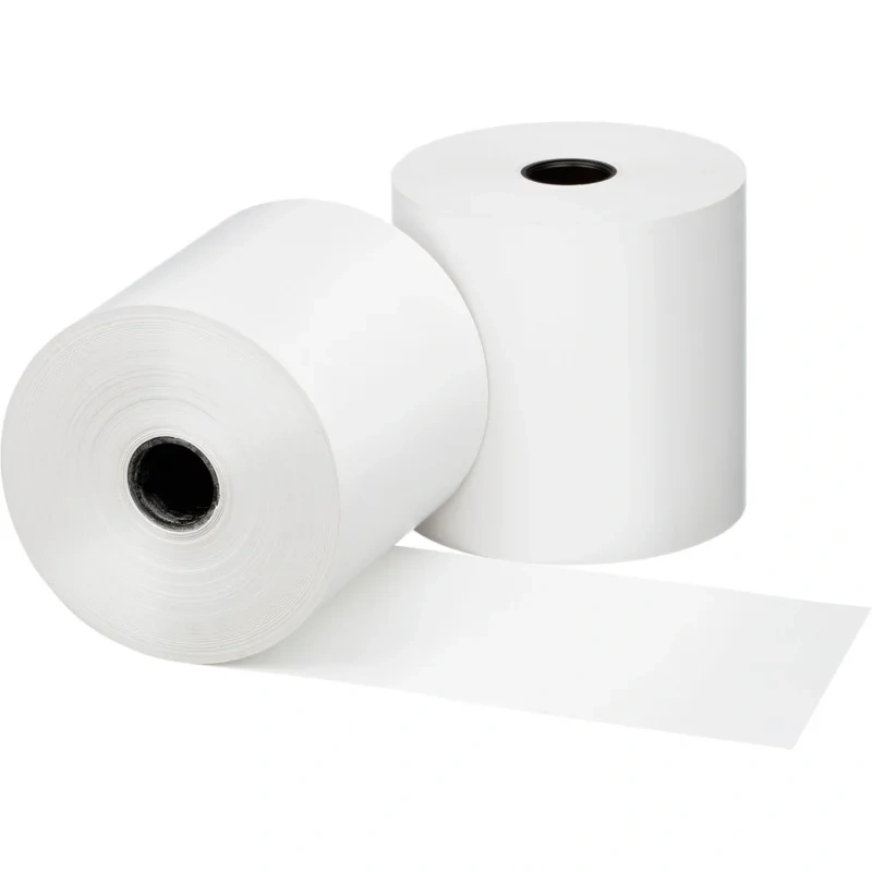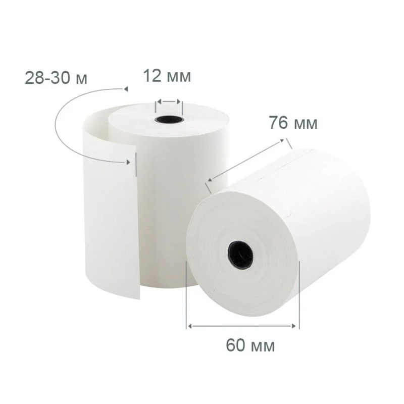 Чековая лента изготовлена из офсетной бумаги белизной 95% и плотностью 65 г/кв.м. Ролик имеет ширину 76 мм и общую длину намотки 28-30 м. Диаметр ролика — 60 мм, диаметр втулки — 12 мм.