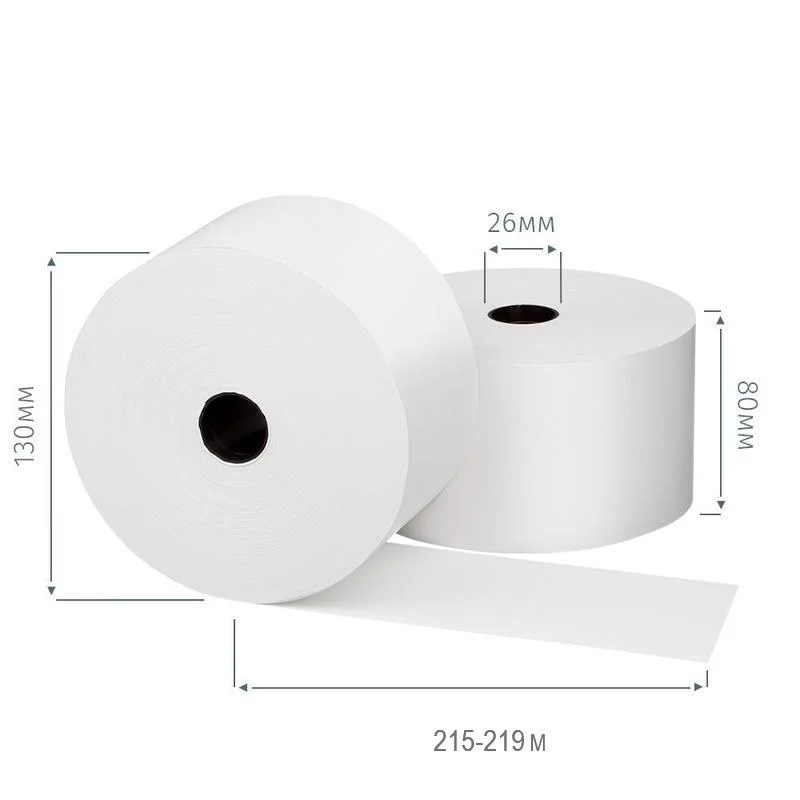 Чековая лента изготовлена из термобумаги. Бумажное полотно с наружным термослоем имеет ширину 80 мм и общую длину 215-219 метров. Диаметр намотки — 130 мм, диаметр втулки — 26 мм. Поставляются в термоусадочной пленке и гофрокоробах. Ролики для термопечати используются в кассовых аппаратах и калькуляторах со встроенным или внешним термопринтером.Цвет печати — черный.