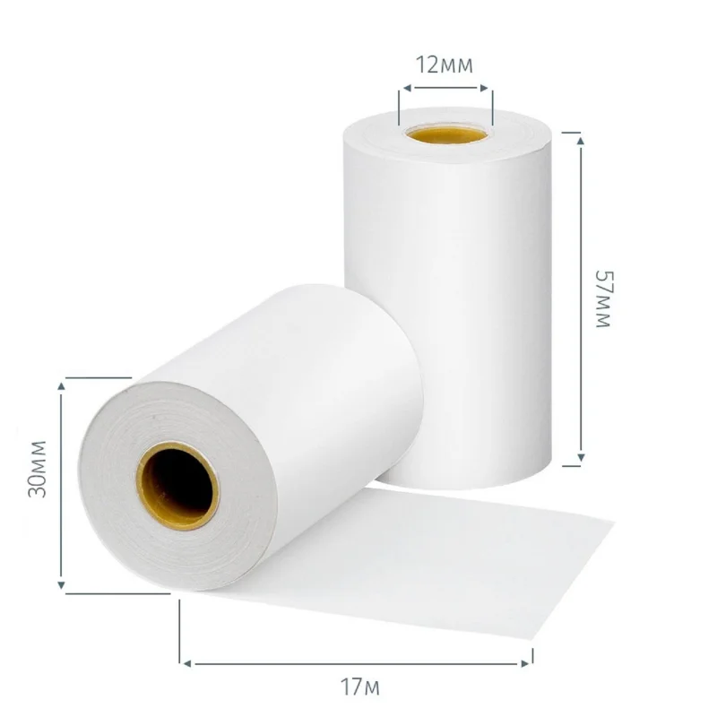 Чековая лента изготовлена из термобумаги. Бумажное полотно с наружным термослоем имеет ширину 57 мм и общую длину 17 метров. Диаметр намотки — 30 мм, диаметр втулки — 12 мм. Поставляются в термоусадочной пленке и гофрокоробах. Ролики для термопечати используются в кассовых аппаратах и калькуляторах со встроенным или внешним термопринтером. Цвет печати — черный.