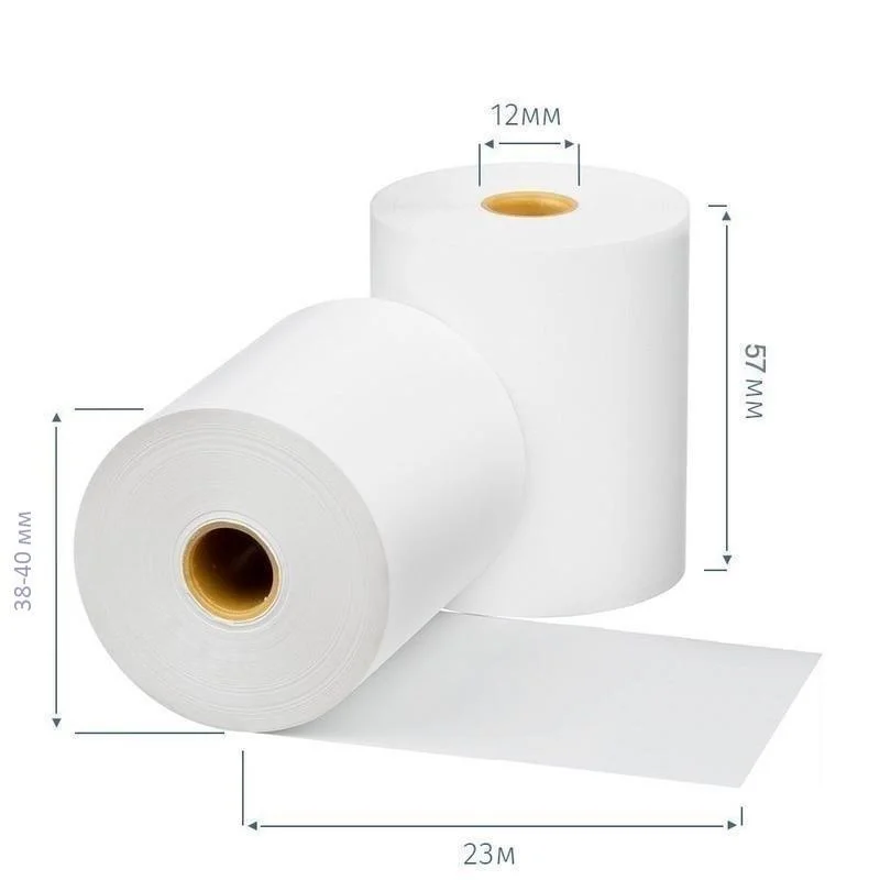 Чековая лента изготовлена из термобумаги. Бумажное полотно с наружным термослоем имеет ширину 57 мм и общую длину 23 метра. Диаметр намотки — 38-40 мм, диаметр втулки — 12 мм. Поставляются в термоусадочной пленке и гофрокоробах. Ролики для термопечати используются в кассовых аппаратах и калькуляторах со встроенным или внешним термопринтером. Цвет печати — черный.