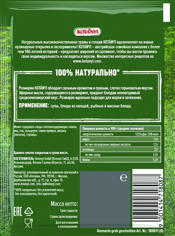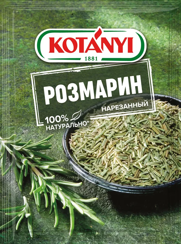 Розмарин нарезанный Kotanyi, 15 г – это приправа, которая имеет сильный, насыщенный аромат и горьковатый вкус. В состав входит большое количество витаминов, минеральных веществ, органических ненасыщенных кислот. Розмарин обладает множеством полезных свойств. Он способен снижать мышечные, нервные боли после физических упражнений, купировать головные боли, повышать мозговую активность, активизировать иммунитет, разжижать мокроту и т.д. Розмарин довольно часто используется в итальянской, греческой, французской кухне. Такую приправу можно добавлять в закуски, горячие блюда, соления и напитки. Розмарин хорошо сочетается с петрушкой, чабрецом, чесноком, лимоном, черным перцем, перцем чили.