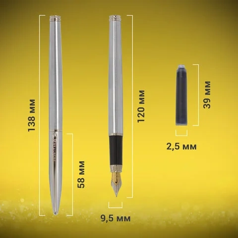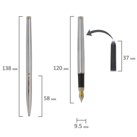 Стильная модель перьевой ручки с корпусом из металла серебристого цвета и хромированными деталями. Синий цвет чернил, иридиевое перо украшено гравировкой. Диаметр пишущего узла 0,7 мм создает ровню линию письма. Тип пера – M (Medium) – средняя ширина линии. Размер картриджа – 37 мм.