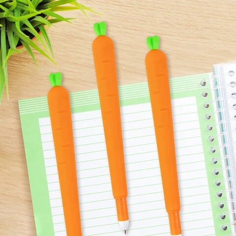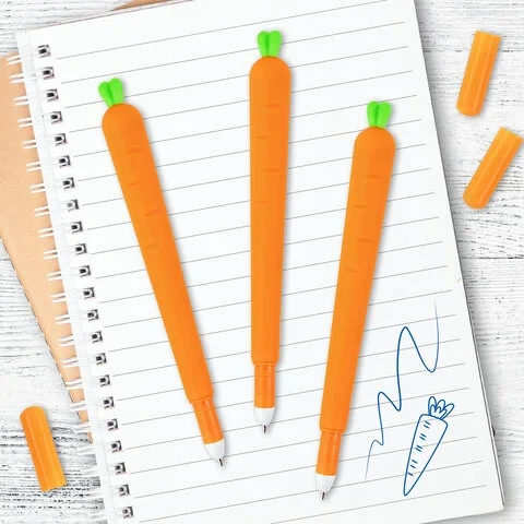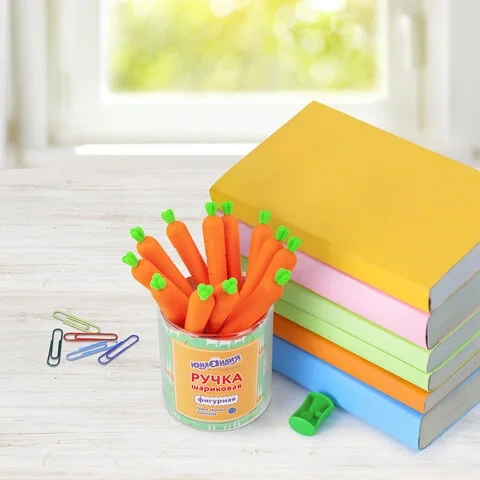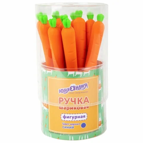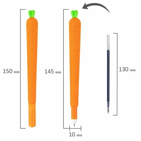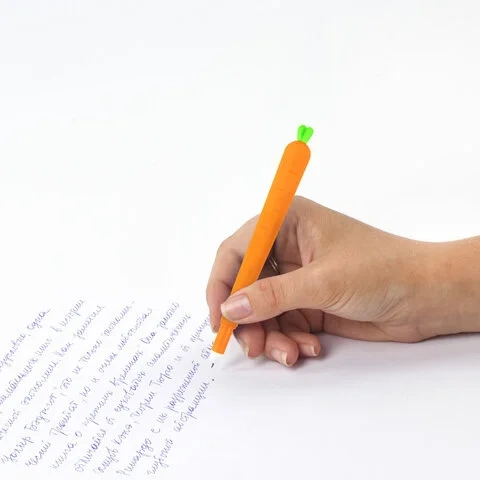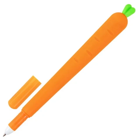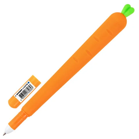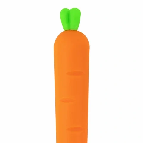 Шариковая ручка серии FUNNY YUMMY с мягким силиконовым корпусом и оригинальным дизайном в виде морковки. Благодаря привлекательному дизайну ее не захочется выпускать из рук. Диаметр стандартного пишущего узла, равный 0,7 мм, создает линию письма, равную 0,35 мм. Длина сменного стержня составляет 130 мм. Цвет чернил - синий. Цвет корпуса - ассорти.