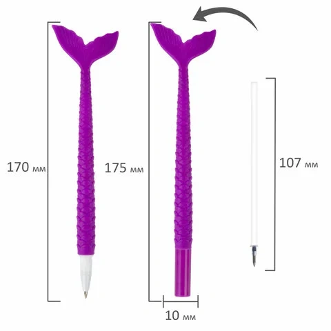 Шариковая ручка серии FUNNY YUMMY с мягким силиконовым корпусом и оригинальным дизайном в виде русалки. Благодаря привлекательному дизайну ее не захочется выпускать из рук. Диаметр стандартного пишущего узла, равный 0,7 мм, создает линию письма, равную 0,35 мм. Длина сменного стержня составляет 107 мм. Цвет чернил - синий. Цвет корпуса - ассорти.