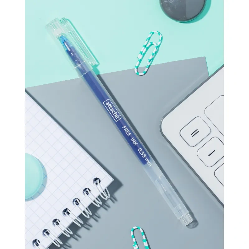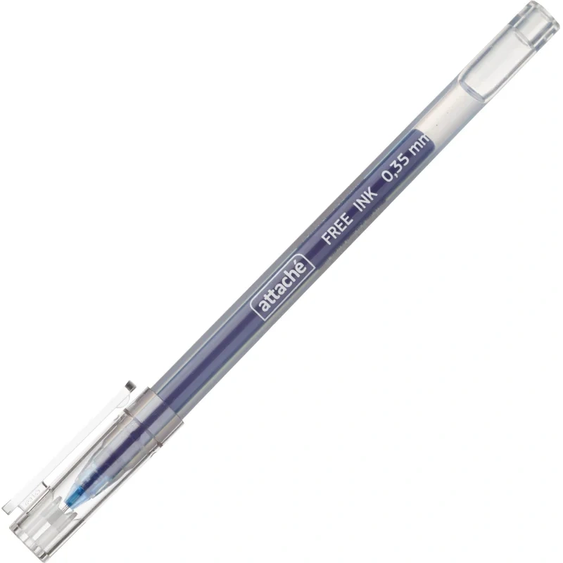 Ручка гелевая неавтоматическая Attache Free ink изготовлена из качественного пластика. Ручка обеспечивает легкое и мягкое письмо. Чернила быстро высыхают и не оставляют подтеков. Длина линии письма — 800 м. Ручка имеет круглый корпус прозрачного цвета, что позволяет следить за уровнем чернил. Детали ручки синего цвета и соответствуют цвету чернил. Смена стержня не предусмотрена. Диаметр пишущего узла, равный 0,5 мм, создает линию письма, равную 0,35 мм. Цвет чернил: синий. Игольчатый наконечник обеспечивает сверхтонкое письмо. Особый акцент этой ручке придает лаконичный дизайн.