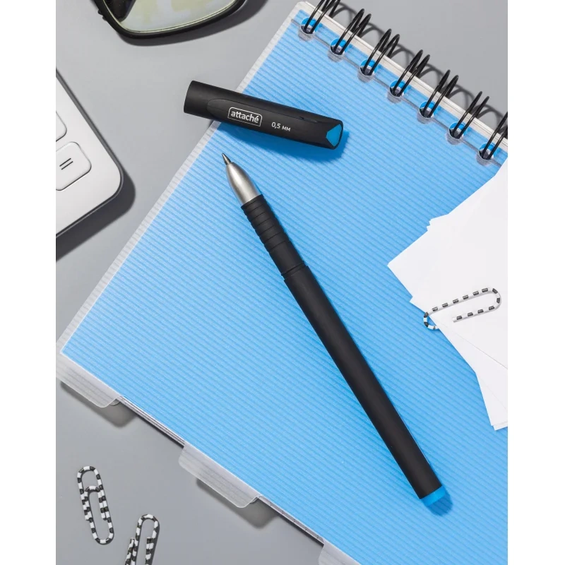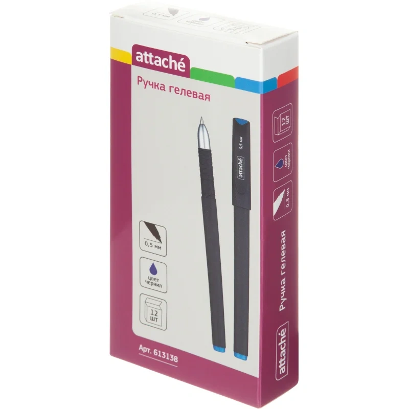 Ручка гелевая неавтоматическая Attache изготовлена из особого пластика soft-touch, приятного на ощупь. Ручка обеспечивает легкое и мягкое письмо. Чернила быстро высыхают, не размазываются. На корпусе отмечена удобная зона для захвата. Ручка имеет круглый корпус черного цвета. Детали ручки синего цвета соответствуют цвету чернил. Сменный стержень длиной 129 мм позволит использовать ручку максимально долго. Имеет стандартный наконечник. Диаметр пишущего узла, равный 0.5 мм, создает линию письма, равную 0.5 мм. Цвет чернил: синий. Особый акцент этой ручке придает современный дизайн.