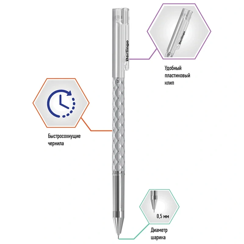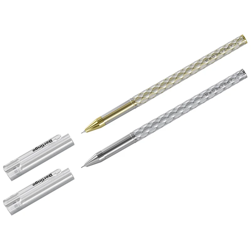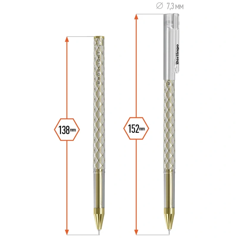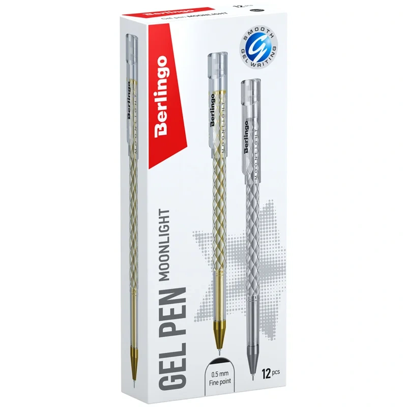 Гелевая ручка Berlingo 'Moonlight' выполнена в изящном круглом корпусе с оригинальной отделкой золотой и серебристой фольгой. Стержень украшен в цвет отделки корпуса, что в комплексе дает уникальное дизайнерское решение. Поставляется в коробочках по 12 штук: 6 золотых и 6 серебряных. Диаметр пишущего узла составляет 0,5 мм, благодаря чему получается тонкая, аккуратная линия.
