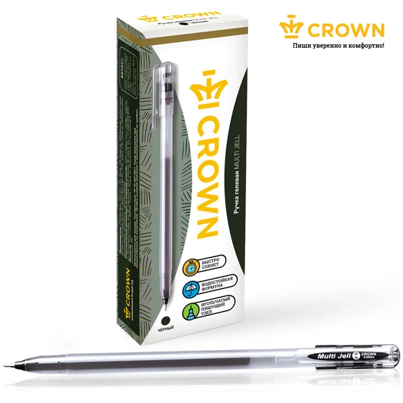 Гелевая ручка Crown 'Multi Jell' - одноразовая гелевая ручка с ультратонким наконечником, которая подходит для экзаменов, ведения документооборота, заполнения бланков, заметок в ежедневнике, заполнения личного дневника, рисунков в скетчбуке. Корпус сделан из высококачественного первичного пластика, который в случае поломки не оставляет острых углов и мелких осколков. Корейские гелевые чернила на водной основе обладают высокой светостойкостью и водостойкостью, мгновенно высыхают, не смазываются и обеспечивают мягкое и комфортное письмо.Благодаря гелеобразной консистенции чернил и специальной технологии двух подпружиненных шариков в пишущем узле гелевые ручки Crown обеспечивают мягкое и комфортное письмо.Равномерно измельченный пигмент в составе чернил позволяет писать ярко без пропусков и исключает царапины на бумаге. Легкая изящная линия письма, мягкое скольжение по бумаге.Цвет чернил - черная, диаметр пишущего узла - 0,4 мм. Упаковка: картонная коробка по 12 штук.