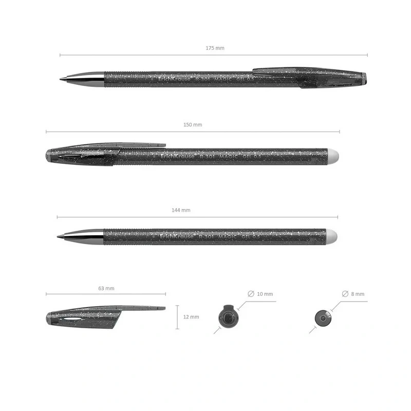 Гелевая ручка Stick со стираемыми чернилами, стандартным типом пишущего узла и заменяемым стержнем. Ручка имеет полупрозрачный, тонированный круглый корпус с блестками и с удобной профилированной грип-зоной, оснащенный заглушкой-ластиком. Пишущий узел с диаметром шарика 0.5 мм в сочетании с гелевыми быстросохнущими чернилами обеспечивает точное и быстрое письмо без усилий. Длина непрерывной линии составляет 200 м при толщине 0.4 мм. Модель R-301 Magic Gel - ценовой лидер в категории ручек 'пиши-стирай'.