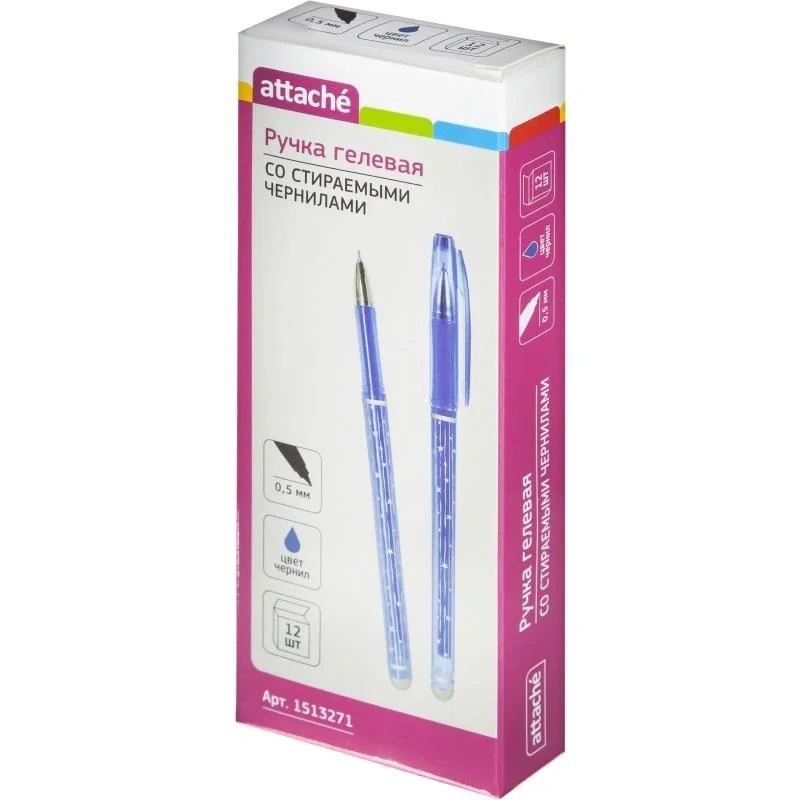 Ручка гелевая Attache со стираемыми чернилами синего цвета обладает игольчатым наконечником, обеспечивающим толщину линии письма 0,5 мм. Термочувствительные чернила становятся невидимыми при нагревании. Для удаления надписи необходимо потереть ее специальным ластиком, встроенным в основание тыльной части ручки. При письме и стирании ручка не повреждает структуру бумаги, делая исправления незаметными. Ручка не рекомендована для использования в деловых документах.