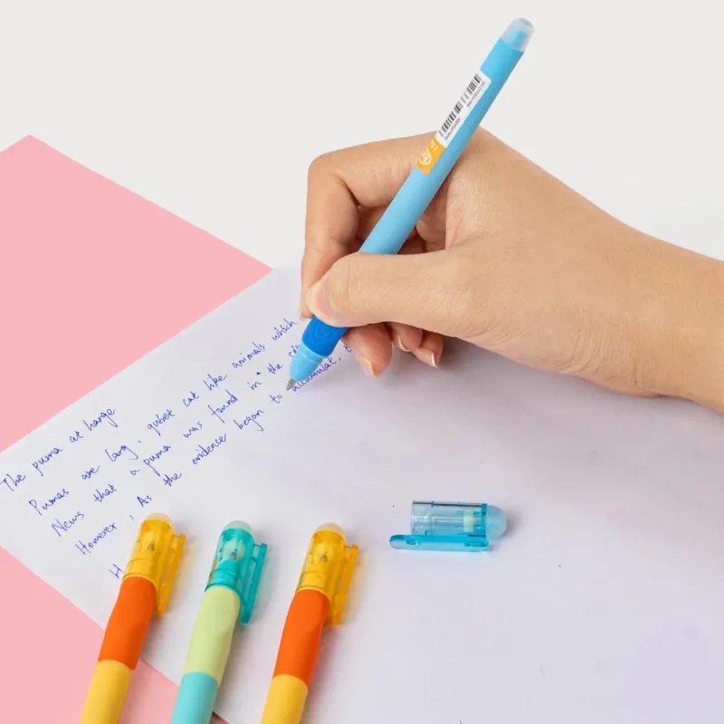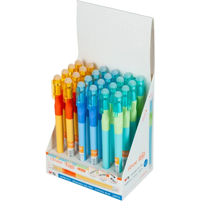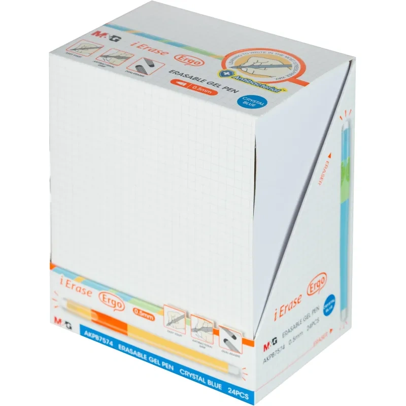 Ручка гелевая M&G iErase Ergo обладает уникальными обесцвечивающимися термо-чернилами . Для удаления надписи необходимо потереть ее специальным ластиком, встроенным в колпачок ручки. При письме и стирании ручка не повреждает структуру бумаги, делая исправления незаметными. Ручка не рекомендована для использования в деловых документах. Резиновая манжетка обеспечивает удобный захват ручки и комфорт во время письма. Корпус имеет покрытие soft touch. Диаметр шарика — 0,5 мм. Толщина линии письма — 0,3 мм. Цвет чернил — синий.