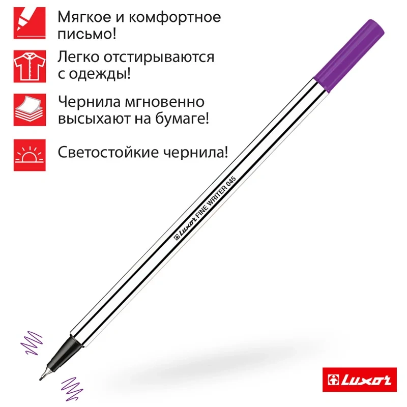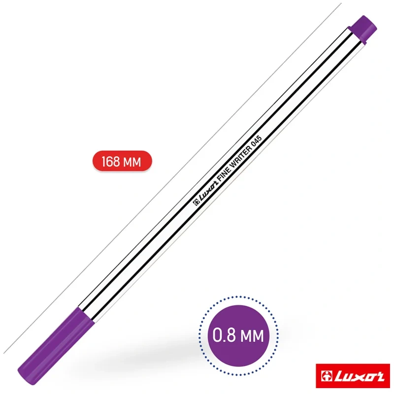 Капиллярная ручка Luxor Fine Writer - линер, тонкопишущий фломастер и чертежный инструмент одновременно. Цветная ручка подходит для письма на бумаге, черчения, эскизов, рисунков в скетчбуке и рисунков на крафтовой бумаге, прорисовывания мелких элементов. Особенность капиллярных ручек - это умение подстраиваться под силу нажима, из-за чего напряжение на руку при письме не ощущается. Luxor Fine Writer пишут очень тонкой равномерной линией, оставляя четкий и достаточно контрастный след. Наконечник изготавливается из твёрдого пластика, благодаря чему обеспечивается одинаковая толщина линий при разных наклонах ручки, линия остается тонкой и ровной при длительном письме.Светостойкие чернила на водной основе не выцветают под воздействием солнечных лучей и легко отстирываются с одежды. Капиллярные ручки Luxor до 7 дней не высыхает без колпачка, а при закрытом колпачке в течение 10 часов полностью восстанавливают свои свойства!Чернила мгновенно высыхают на бумаге, поэтому надписи и рисунки не размазываются. Цвет чернил - фиолетовый, диаметр пишущего узла - 0,8 мм. Упаковка: картонная коробка по 12 штук. Рисуй ярко и пиши мягко вместе с капиллярными ручками Luxor.