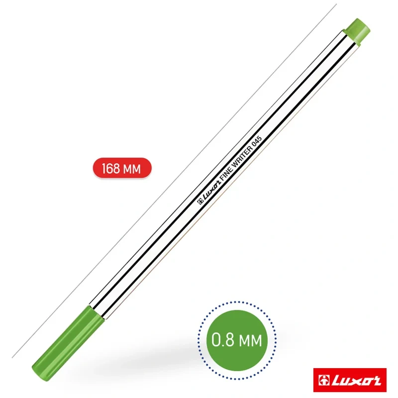 Капиллярная ручка Luxor Fine Writer - линер, тонкопишущий фломастер и чертежный инструмент одновременно. Цветная ручка подходит для письма на бумаге, черчения, эскизов, рисунков в скетчбуке и рисунков на крафтовой бумаге, прорисовывания мелких элементов. Особенность капиллярных ручек - это умение подстраиваться под силу нажима, из-за чего напряжение на руку при письме не ощущается. Luxor Fine Writer пишут очень тонкой равномерной линией, оставляя четкий и достаточно контрастный след. Наконечник изготавливается из твёрдого пластика, благодаря чему обеспечивается одинаковая толщина линий при разных наклонах ручки, линия остается тонкой и ровной при длительном письме.Светостойкие чернила на водной основе не выцветают под воздействием солнечных лучей и легко отстирываются с одежды. Капиллярные ручки Luxor до 7 дней не высыхает без колпачка, а при закрытом колпачке в течение 10 часов полностью восстанавливают свои свойства!Чернила мгновенно высыхают на бумаге, поэтому надписи и рисунки не размазываются. Цвет чернил - светло-зеленый, диаметр пишущего узла - 0,8 мм. Упаковка: картонная коробка по 12 штук. Рисуй ярко и пиши мягко вместе с капиллярными ручками Luxor.