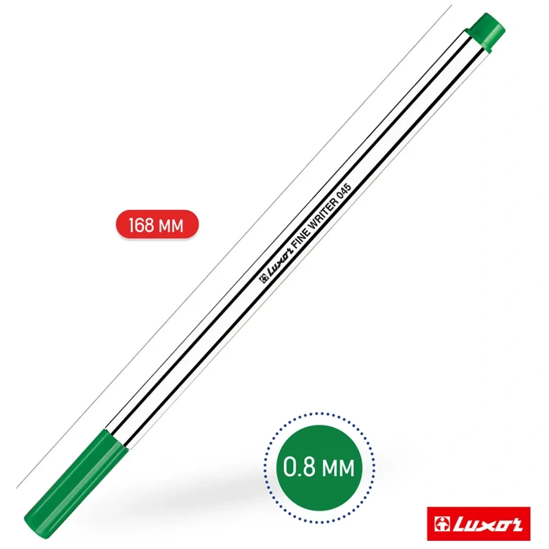 Капиллярная ручка Luxor Fine Writer - линер, тонкопишущий фломастер и чертежный инструмент одновременно. Зеленая ручка подходит для письма на бумаге, черчения, эскизов, рисунков в скетчбуке и рисунков на крафтовой бумаге, прорисовывания мелких элементов. Особенность капиллярных ручек - это умение подстраиваться под силу нажима, из-за чего напряжение на руку при письме не ощущается. Luxor Fine Writer пишут очень тонкой равномерной линией, оставляя четкий и достаточно контрастный след. Наконечник изготавливается из твёрдого пластика, благодаря чему обеспечивается одинаковая толщина линий при разных наклонах ручки, линия остается тонкой и ровной при длительном письме.Светостойкие чернила на водной основе не выцветают под воздействием солнечных лучей и легко отстирываются с одежды. Капиллярные ручки Luxor до 7 дней не высыхает без колпачка, а при закрытом колпачке в течение 10 часов полностью восстанавливают свои свойства!Чернила мгновенно высыхают на бумаге, поэтому надписи и рисунки не размазываются. Цвет чернил - зеленый, диаметр пишущего узла - 0,8 мм. Упаковка: картонная коробка по 12 штук. Рисуй ярко и пиши мягко вместе с капиллярными ручками Luxor.