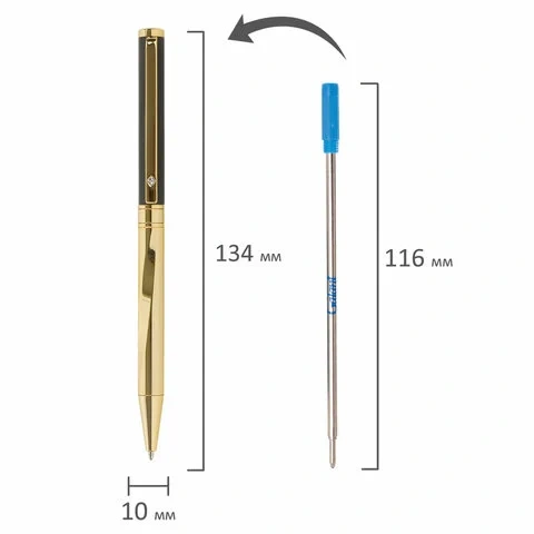 Элегантная модель ручки с корпусом из латуни черно-золотого цвета с декоративным кристаллом. Синий цвет чернил; длина стержня составляет 116 мм, а диаметр пишущего узла - 0,7 мм. Поставляется в индивидуальном подарочном футляре.