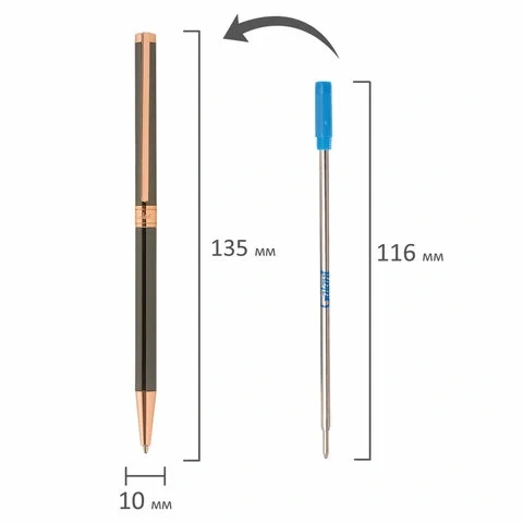 Утонченная модель ручки с корпусом из латуни цвета оружейного металла и бронзовыми деталями. Синий цвет чернил; длина стержня составляет 116 мм, а диаметр пишущего узла - 0,7 мм. Поставляется в индивидуальном подарочном футляре.