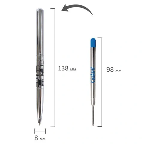 Корпус ручки серебрянного цвета выполнен из латуни, его дополняют хромированные детали. Синий цвет чернил, длина стержня составляет 98 мм, а диаметр пишущего узла - 0,7 мм. Поставляется в индивидуальном подарочном футляре.