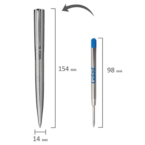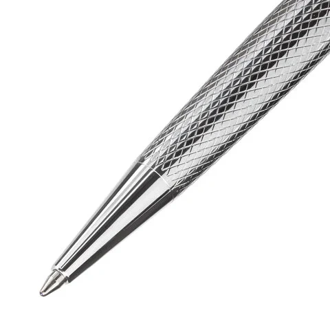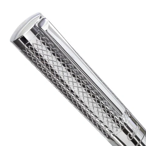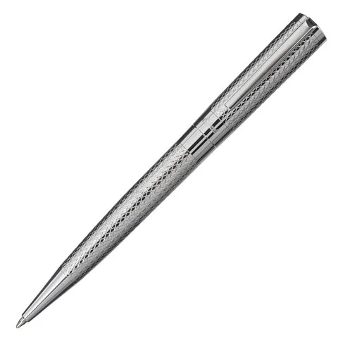 Утонченная модель ручки с корпусом из латуни цвета хром и декоративным узором. Синий цвет чернил; длина стержня составляет 98 мм, а диаметр пишущего узла - 0,7 мм. Поставляется в индивидуальном подарочном футляре.