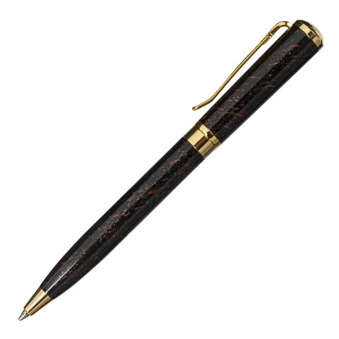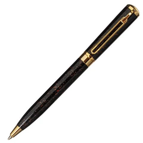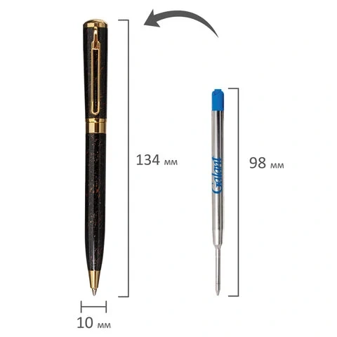 Утонченная модель ручки с корпусом из латуни темно-коричневого цвета и золотыми деталями прекрасно лежит в руке. Синий цвет чернил; длина стержня составляет 98 мм, а диаметр пишущего узла - 0,7 мм. Поставляется в индивидуальном подарочном футляре.