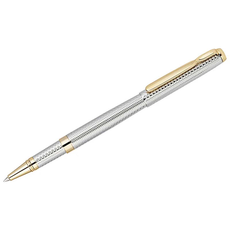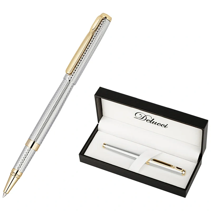 Изящная подарочная ручка-роллер Delucci Celeste подчеркнёт статус обладателя. Серебристый корпус с золотыми вставками и интересное рифление акцентируют внимание на её ценности, медный корпус с никелированием гарантирует прочность. Закрученный клип из нержавеющей стали выполняет не только практическую функцию — закрепить изделие на ежедневнике или кармане, но и добавляет оригинальности.