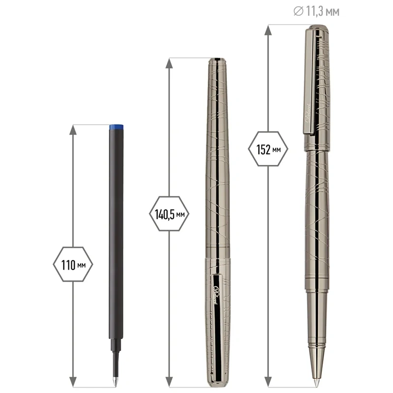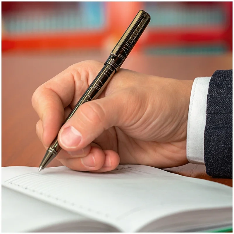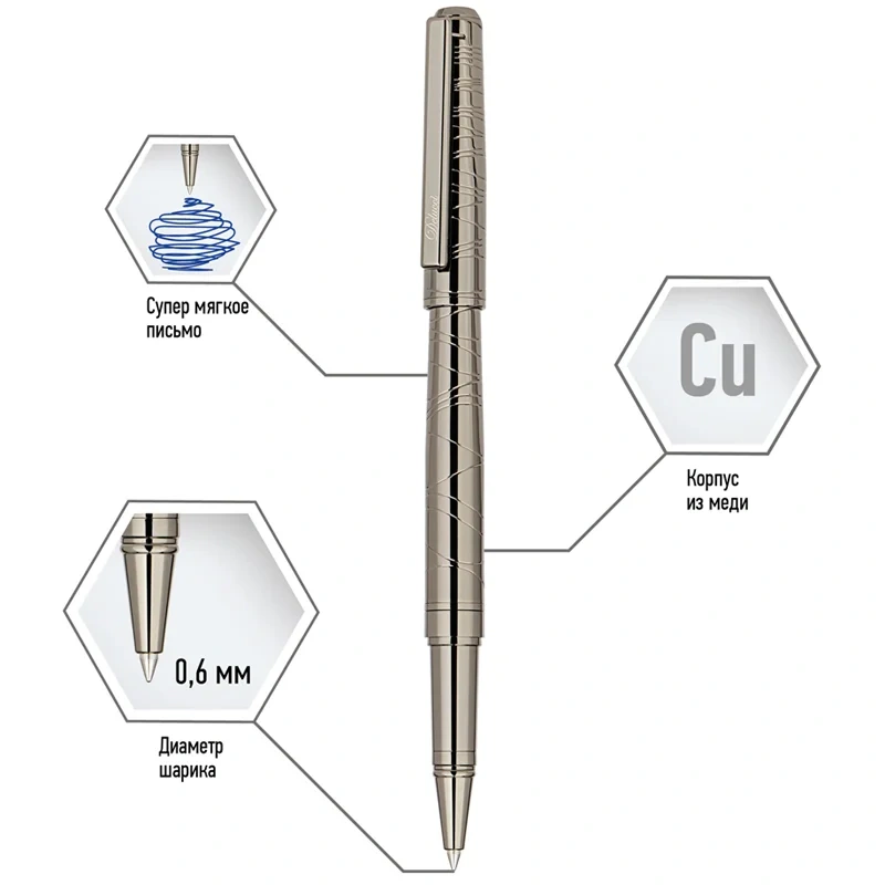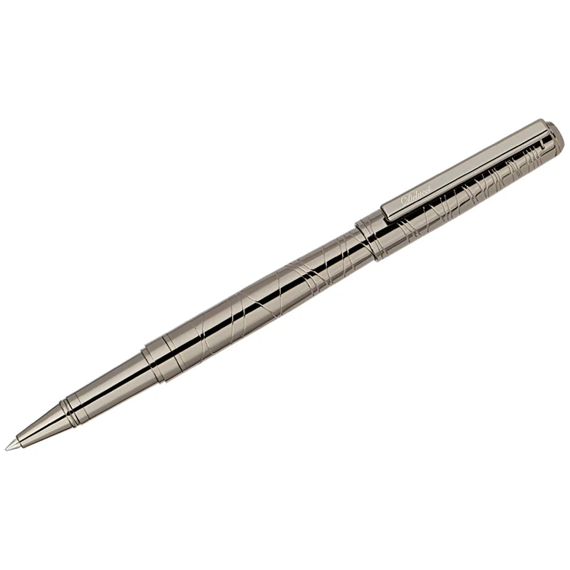 Подарочная ручка-роллер Delucci Mistico со сменным стержнем и черными чернилами – тот самый случай, когда суть напрямую отражена в названии. На колпачок и корпус цвета оружейного металла нанесена переливающаяся гравировка в виде изогнутых линий, которые делают её действительно мистической. Медь и иридий в составе ручки гарантируют её долговечность и качество. Изделие удобно закреплять на планшетах и ежедневниках благодаря прочному клипу, а диаметр пишущего узла в 0,6 мм способствует легкому и быстрому письму толщиной 0,5 мм. упакована в кожаный футляр.