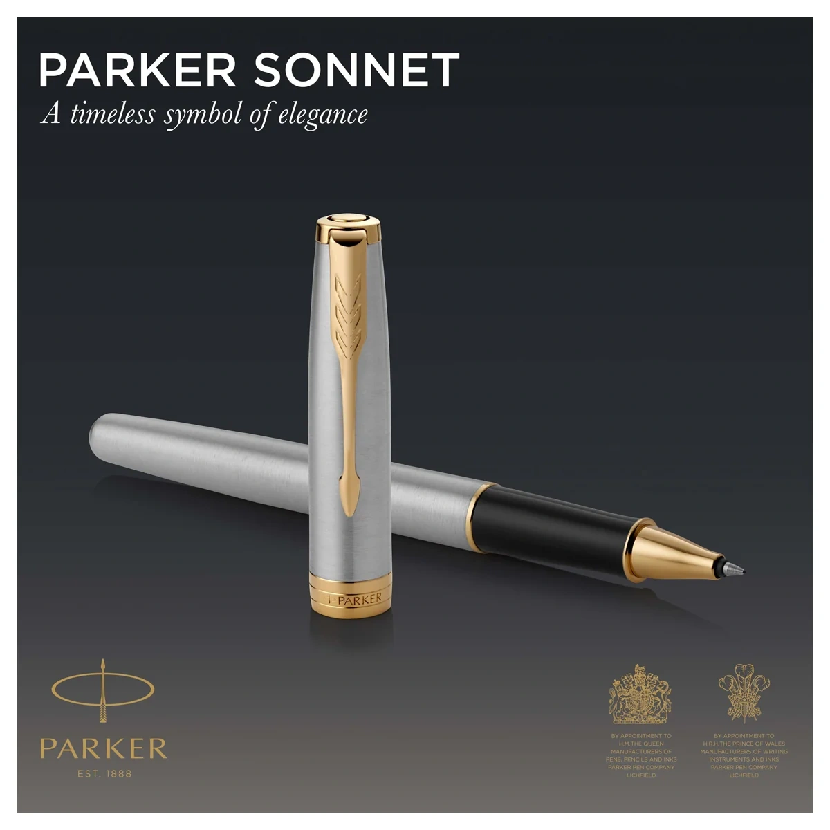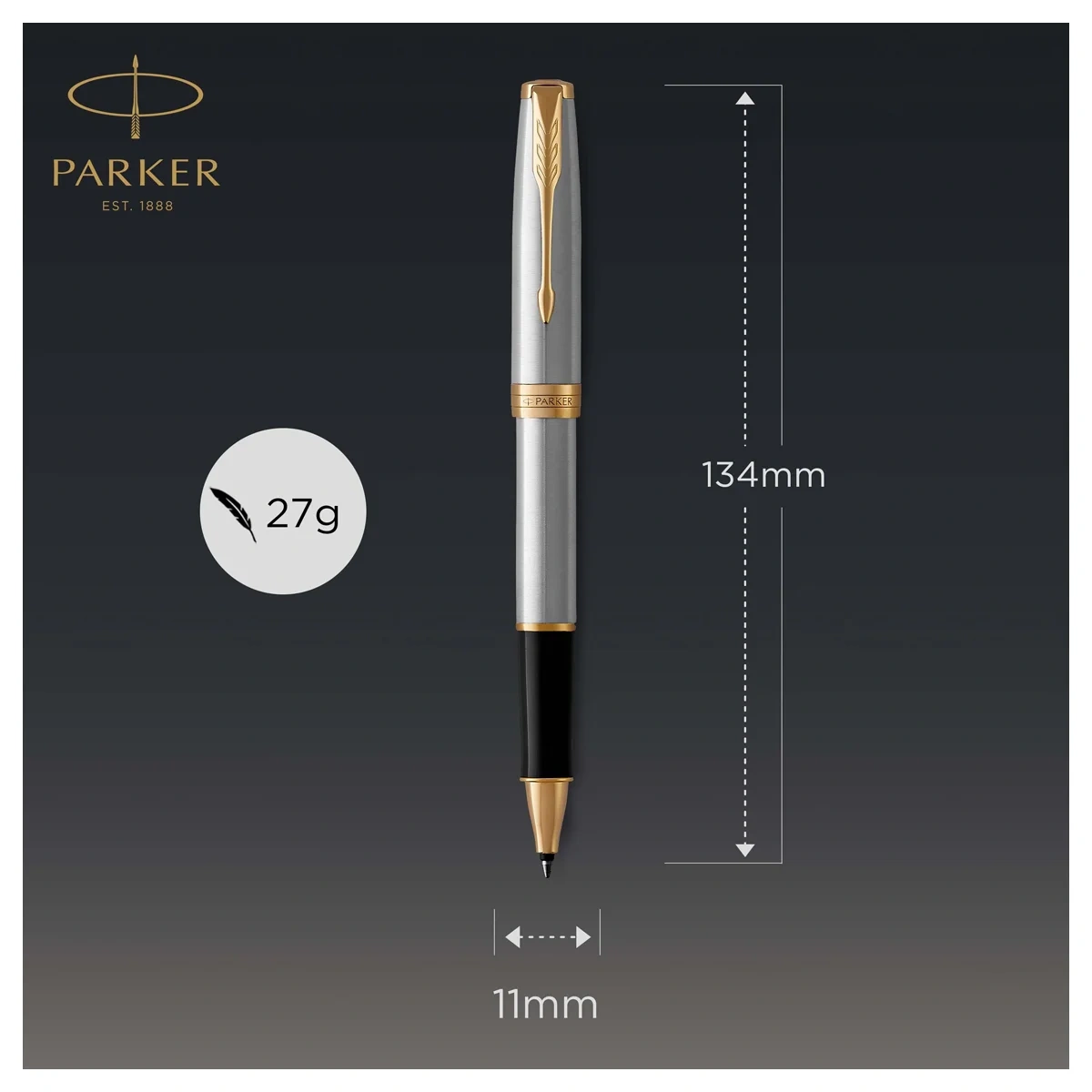 Роллер в корпусе из шлифованной нержавеющей стали и декоративными элементами, покрытыми золотом. ВНИМАНИЕ! С марта 2020г. подарочные коробки ручек ТМ Parker прекратили комплектоваться лифлетами (листовками с гарантийным талоном).