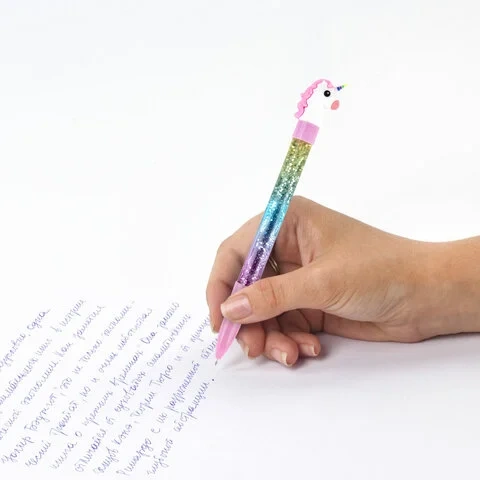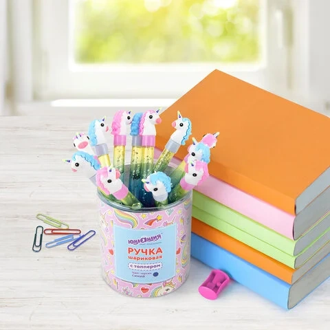 Шариковая ручка серии FUNNY YUMMY с ярким корпусом и оригинальным дизайном топперов в виде единорога. Благодаря привлекательному дизайну ее не захочется выпускать из рук. Диаметр стандартного пишущего узла, равный 0,7 мм, создает линию письма, равную 0,35 мм. Длина сменного стержня составляет 45 мм. Цвет чернил - синий.