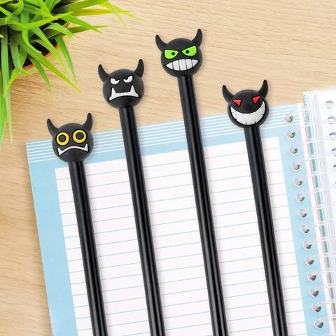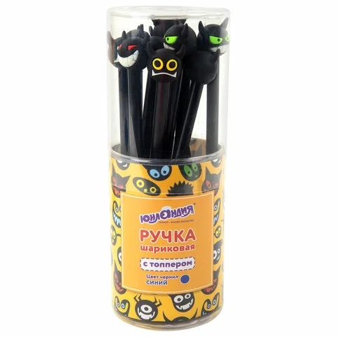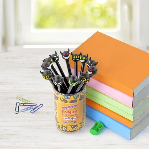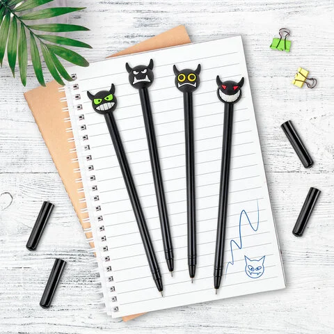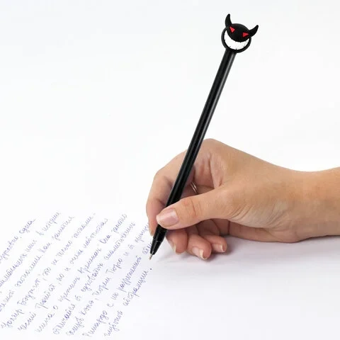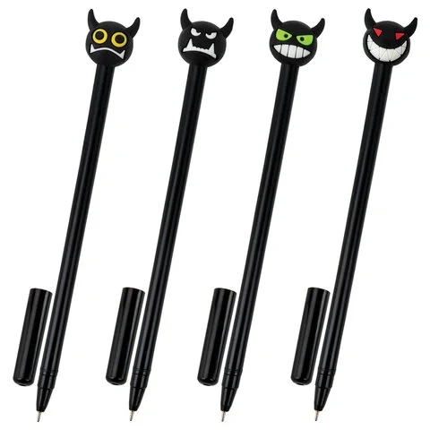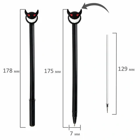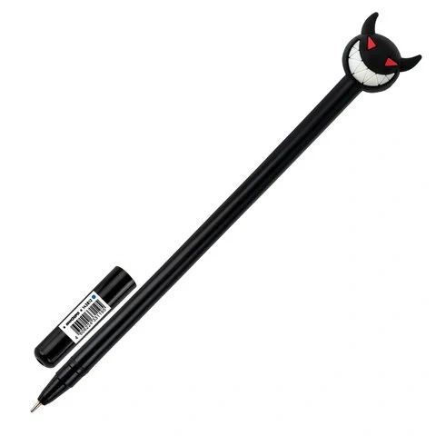 Шариковая ручка серии FUNNY YUMMY с контрастным черным корпусом и оригинальным дизайном топперов в виде чертёнка. Благодаря привлекательному дизайну ее не захочется выпускать из рук, а чернила на масляной основе обеспечат мягкое плавное письмо. Диаметр игольчатого пишущего узла, равный 0,7 мм, создает линию письма, равную 0,35 мм. Длина сменного стержня составляет 129 мм. Цвет чернил - синий.