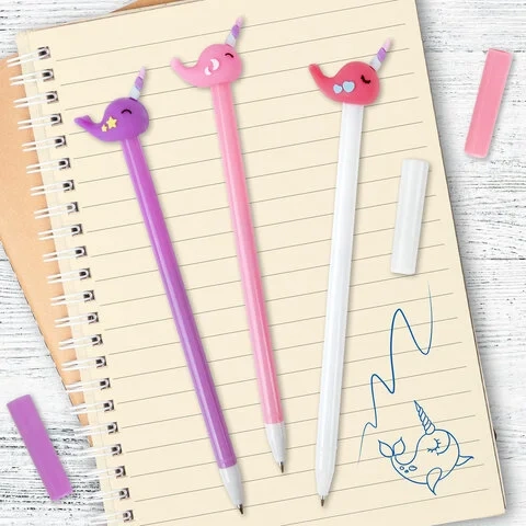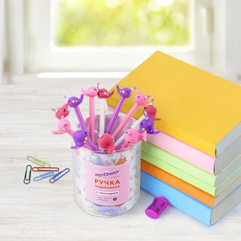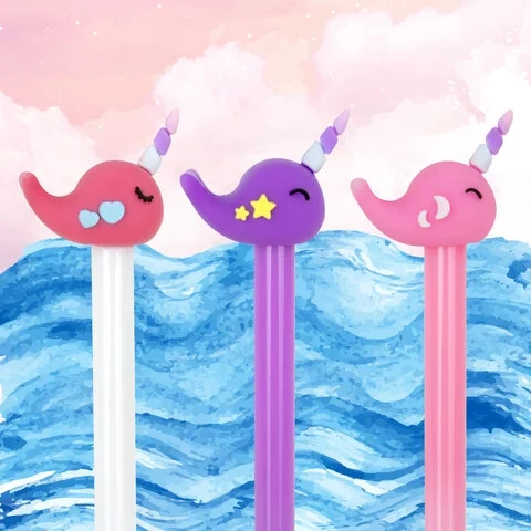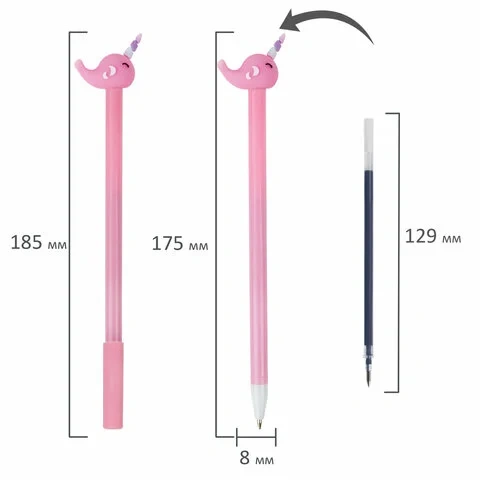 Шариковая ручка серии FUNNY YUMMY с ярким корпусом и оригинальным дизайном топперов в виде кита-единорога. Благодаря привлекательному дизайну ее не захочется выпускать из рук. Диаметр стандартного пишущего узла, равный 0,7 мм, создает линию письма, равную 0,35 мм. Длина сменного стержня составляет 130 мм. Цвет чернил - синий.