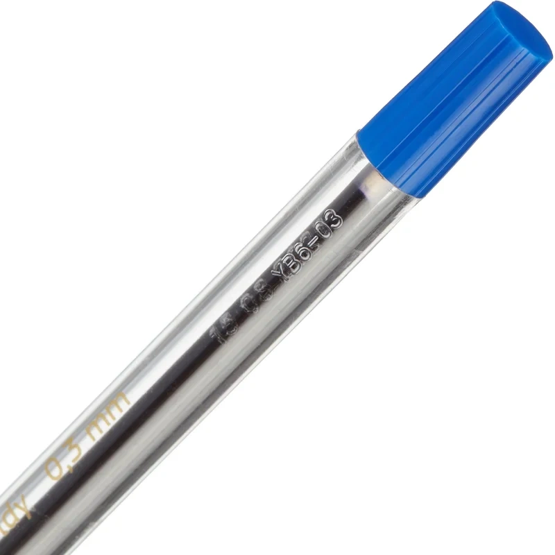 Модель выполнена в пластиковом прозрачном корпусе с колпачком и металлизированным наконечником золотистого цвета. Прозрачный корпус позволяет следить за расходом чернил. Сменный стержень длиной 142 мм имеет игольчатый наконечник и заправлен высококачественными масляными чернилами синего цвета. Встроенный шарик диаметром 0,7 мм создает тонкую линию письма, равную 0,3 мм. Ручка обеспечивает легкое и мягкое письмо, яркие и насыщенные линии.