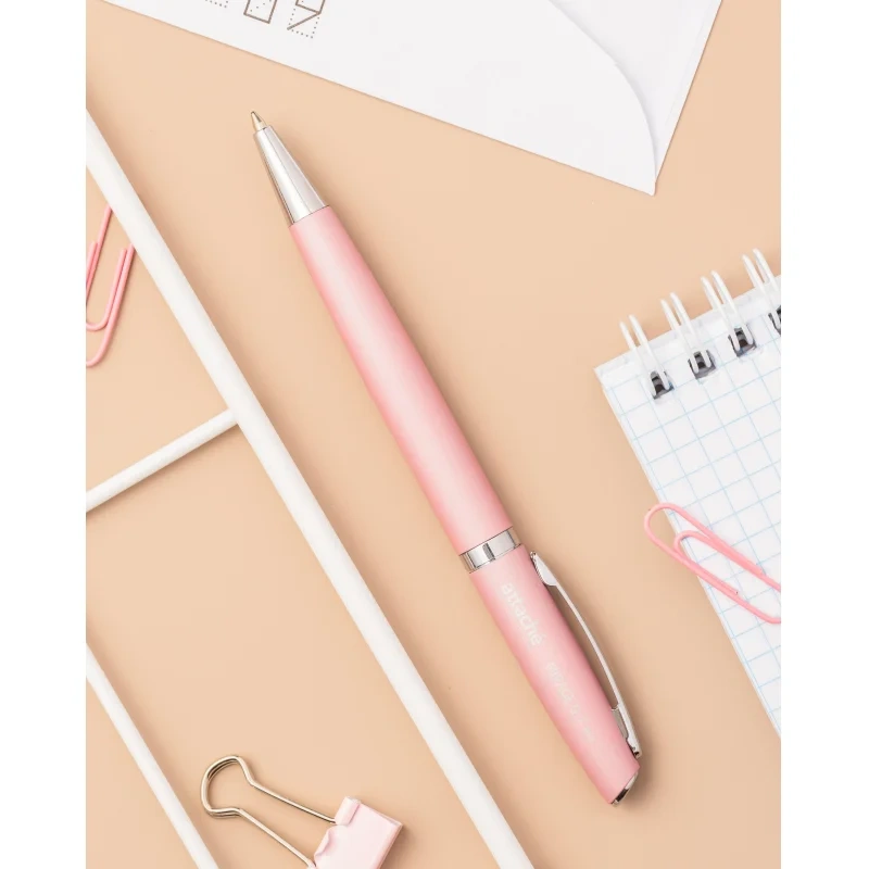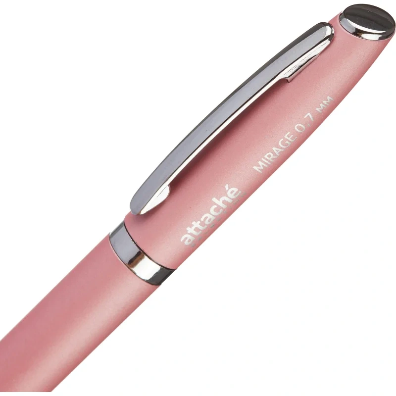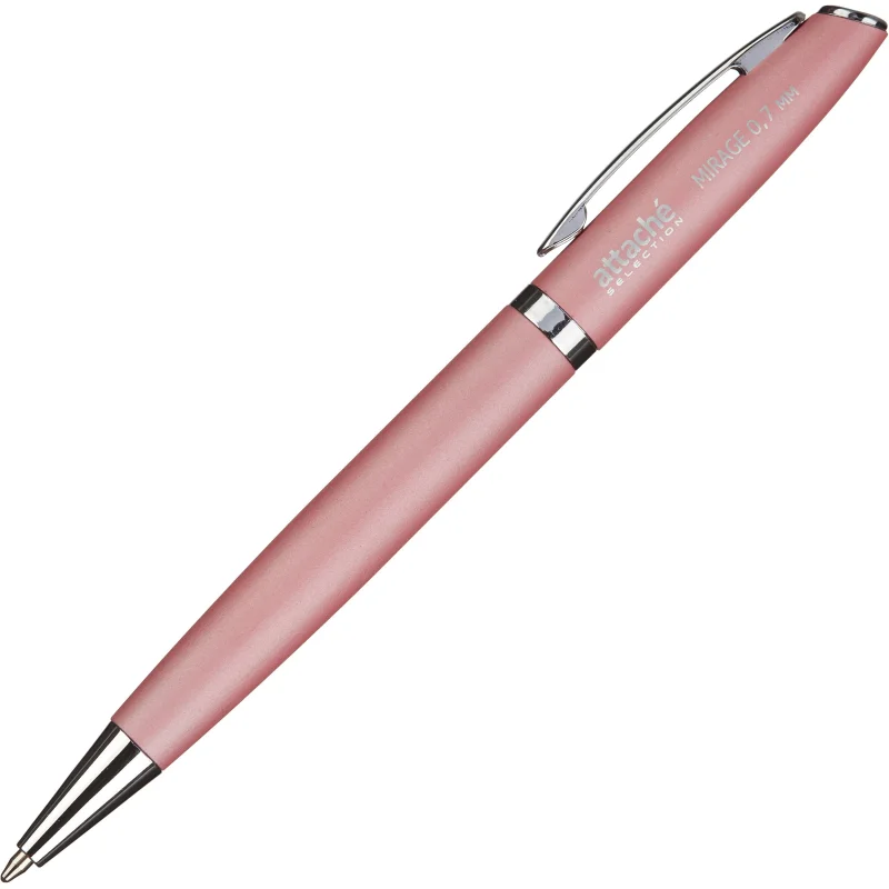 Ручка шариковая автоматическая Attache Selection Mirage - современный дизайн в нежных тонах и надежное качество! Модель имеет алюминиевый корпус розового цвета и оснащена поворотным механизмом. Стильный дизайн ручки дополняет металлический клип, позволяющий плотно закрепить ручку в кармане или тетради для записей. Одним из преимуществ данной модели является наличие сменного стержня с конусообразным наконечником что делает ее экономически привлекательной. Стержень заправлен масляными чернилами синего цвета, что обеспечивает легкое и мягкое письмо, яркие и насыщенные линии. Диаметр пишущего узла 1 мм создает тонкую линию письма, равную 0,7 мм. Длина стержня - 97,5 мм. Стильная ручка Attache Selection Mirage будет надежным помощником в вашей работе или учебе!