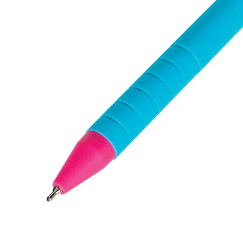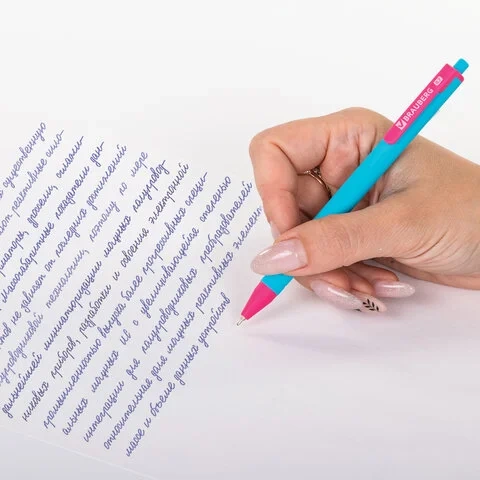 Шариковая автоматическая имеет мягкий прорезиненный корпус ассорти ярких цветов. Ручка снабжена сменным стержнем 107 мм, что позволяет увеличить срок службы. Диаметр пишущего узла 0,7 мм создает тонкую линию письма, равную 0,35 мм. Цвет чернил - синий.