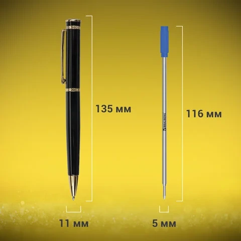 Черный корпус ручки выполнен из металла и декорирован позолоченными деталями. Стержень типа 'Cross' имеет длину 116 мм. Диаметр пишущего узла, равный 1 мм, создает линию письма, равную 0,7 мм. Поворотный механизм обеспечивает надёжность при использовании ручки. Возможно нанесение логотипа. Поставляется в фирменной коробке.