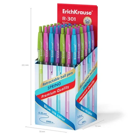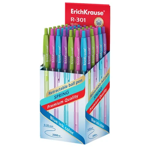 Классическая автоматическая шариковая ручка 'Matic' со стандартным типом пишущего узла и заменяемым стержнем. Ручка имеет полупрозрачный шестигранный корпус нежных пастельных цветов с удобной профилированной грип-зоной. 5-канальный пишущий узел с диаметром шарика 0,7 мм в сочетании с быстросохнущими чернилами обеспечивает мягкое и быстрое письмо. Длина непрерывной линии составляет 2000 м при толщине 0,35 мм. Ручки серии R-301 имеют узнаваемую запатентованную форму и стали бестселлерами в ассортименте шариковых ручек Erich Krause более чем в 50 странах мира.