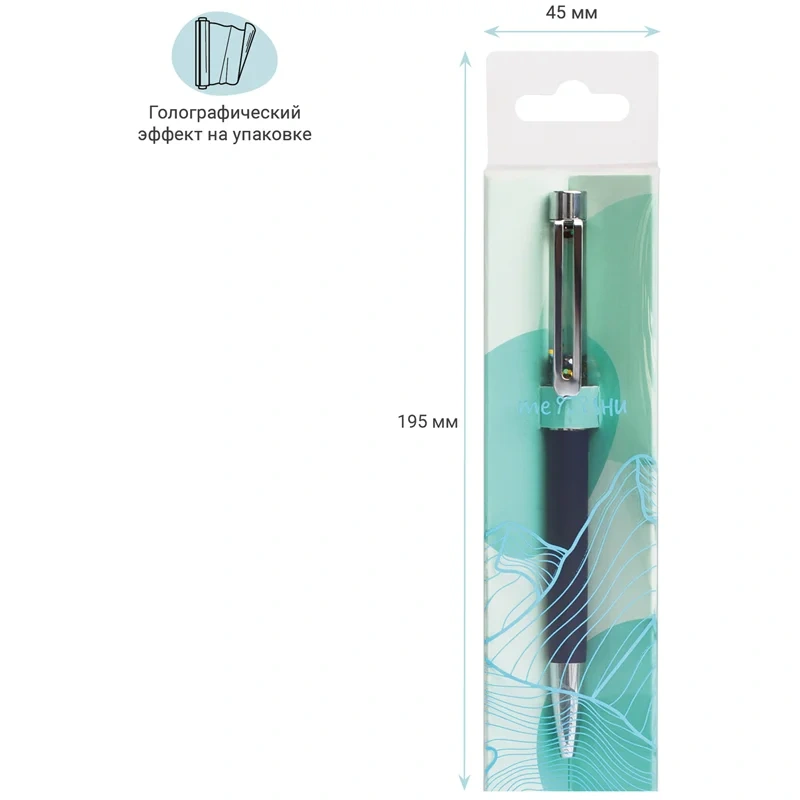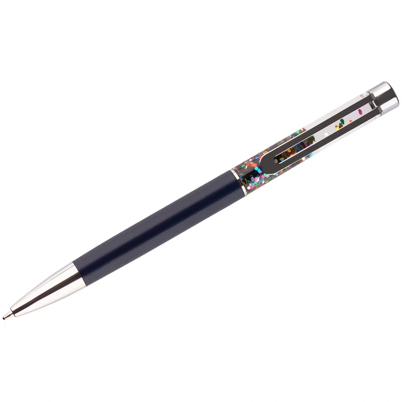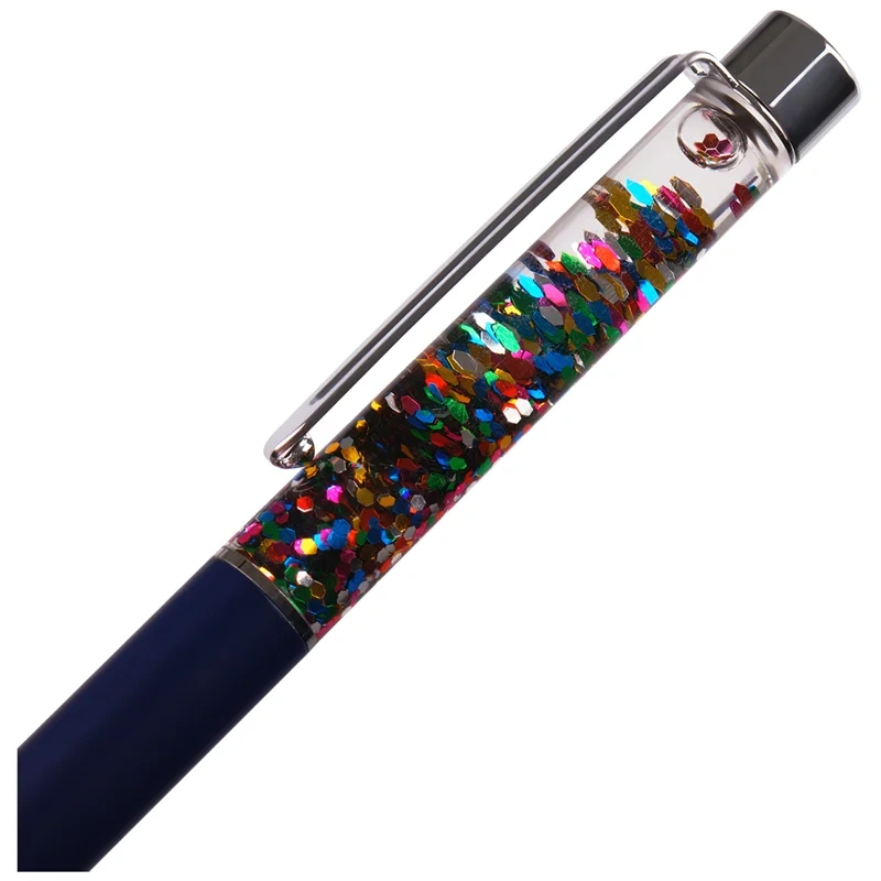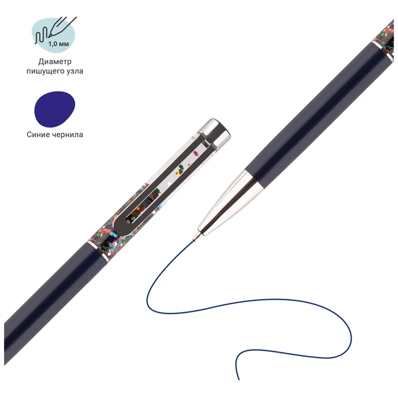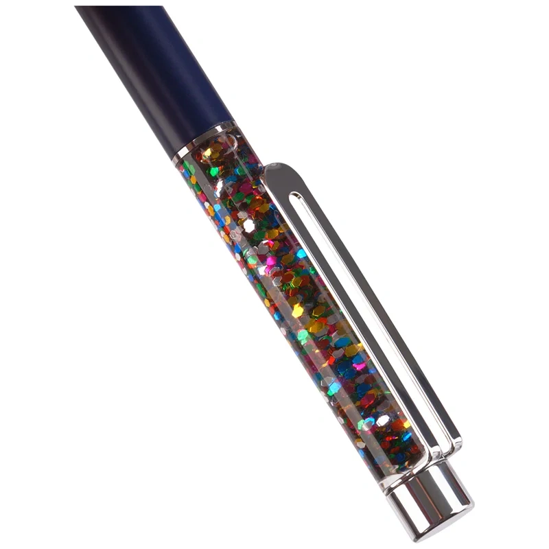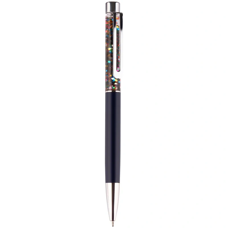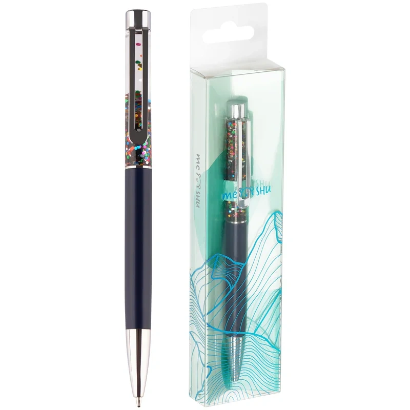 Шариковая ручка MESHU – это привлекательный аксессуар для ярких, смелых и успешных. Диаметр пишущего узла: 1 мм. Ручка подойдёт для мягкого и быстрого письма. Серебряный корпус ручки из металла с темно-синим матовым эффектом украшен вставкой с разноцветным глиттером и дополнен металлическим клипом, с помощью которого ручку можно закрепить на одежде или ежедневнике.