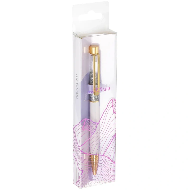 Шариковая ручка MESHU – это привлекательный аксессуар для ярких, смелых и успешных. Золотой корпус ручки из металла с лиловым матовым эффектом украшен вставкой с серебристым глиттером и дополнен металлическим клипом, с помощью которого ручку можно закрепить на одежде или ежедневнике.