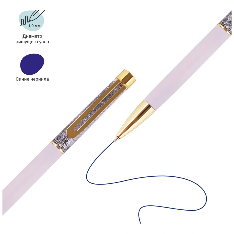 Ручка Lilac sand обязательно принесет удачу в заключении важных контрактов и торжественных соглашений. Изящные и плавные линии, декоративные детали станут неотъемлемой частью праздничной и радостной атмосферы. Благодаря упаковке с голографическими элементами ручка может стать приятным подарком. Диаметр пишущего узла составляет 1 мм, а значит ручка подойдёт для мягкого и быстрого письма. Толщина линии составляет 0,8 мм. Длина сменного стержня 142 мм. Ручка оснащена поворотным механизмом, что говорит о надёжности и безопасности изделия – стержень не повредится в сумке и не оставит следов на посторонних предметах. Благодаря чернилам синего цвета ручку можно использовать в работе или учёбе на постоянной основе.