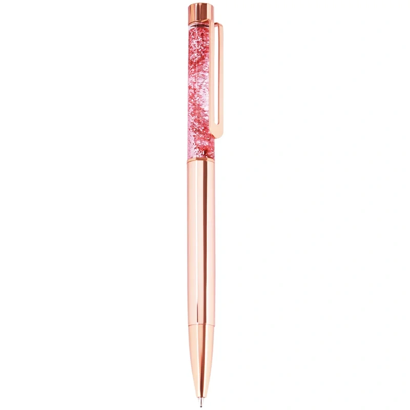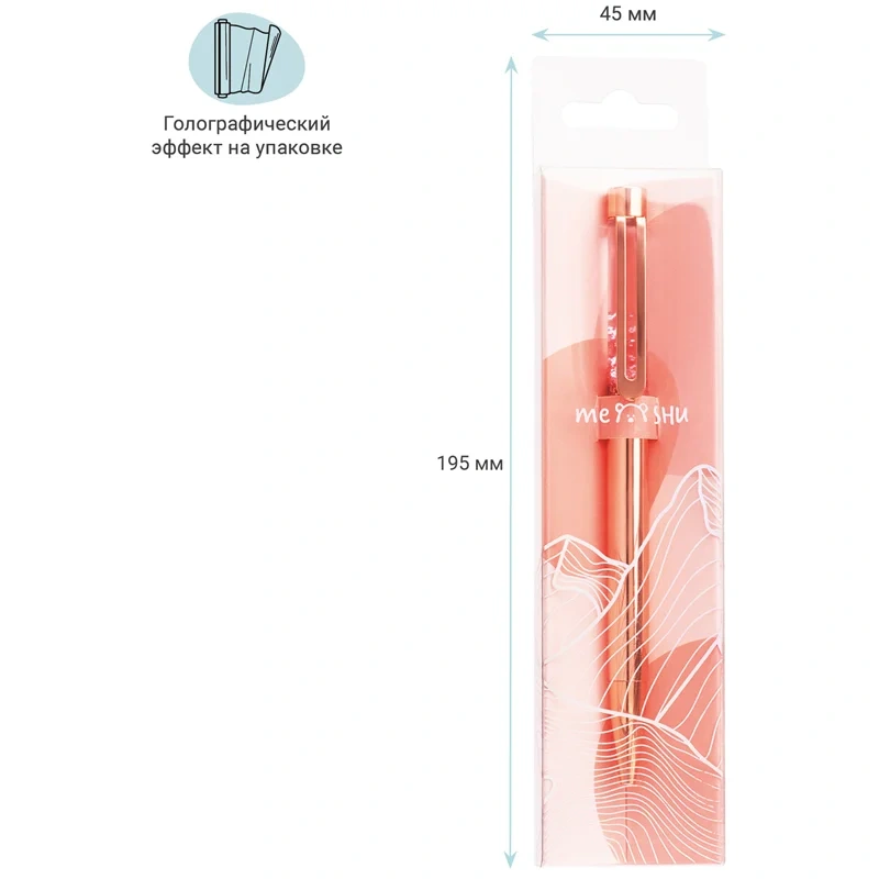 Шариковая ручка MESHU – это привлекательный аксессуар для ярких, смелых и успешных. Корпус ручки из металла под розовое золото украшен вставкой с глиттером и дополнен металлическим клипом, с помощью которого ручку можно закрепить на одежде или ежедневнике.