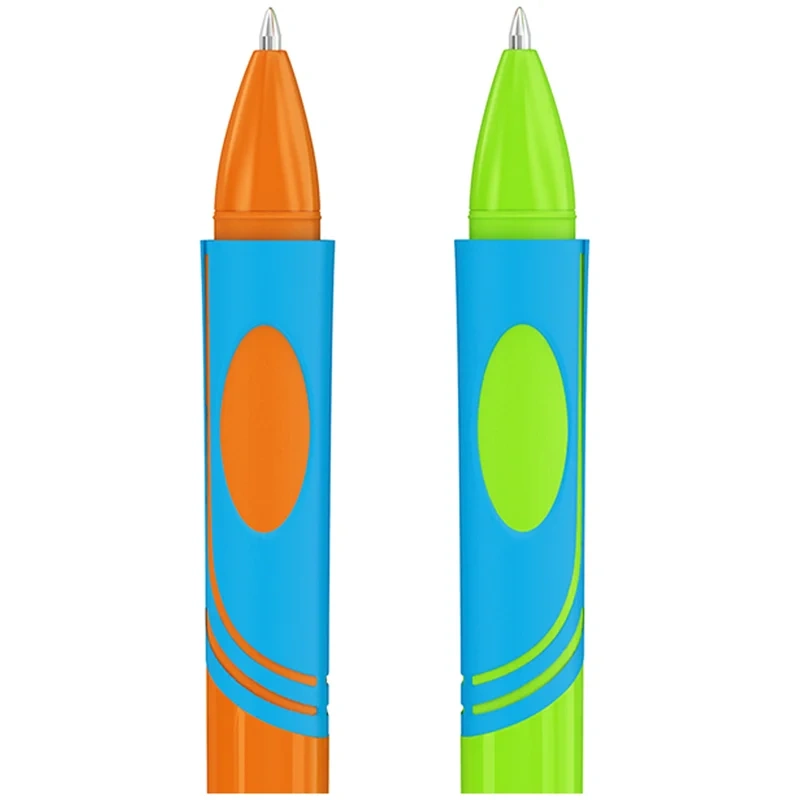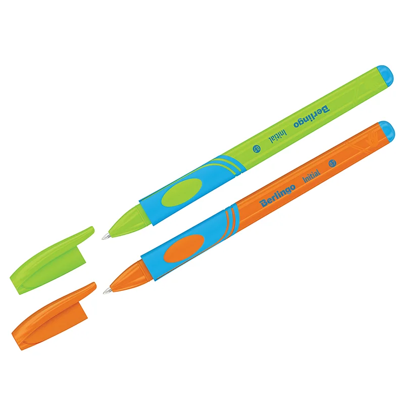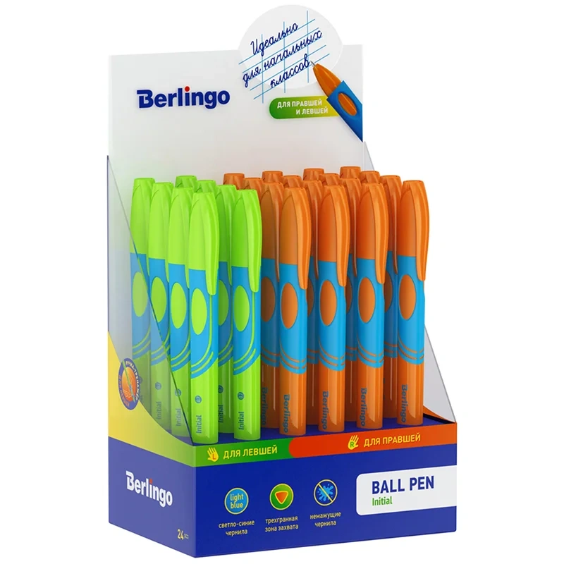 Шариковая ручка Berlingo Initial - идеальный инструмент дошкольника и первоклассника! Ручка выполнена в эргономичном трёхгранном корпусе увеличенного диаметра для максимального комфорта маленьких пальчиков. Мягкий резиновый грип в зоне захвата дополнен специальными выемками, которые обозначают места правильного расположения пальцев для оптимального письма и постановки лучшего почерка. Светло-синие чернила со специальной формулой мгновенного высыхания позволяют оформлять работу аккуратно и без 'смазывания' надписей как правшам, так и левшам. Надписи, сделанные такими чернилами легко читаются. На задней части ручки есть обозначение 'L' или 'R' для левшей или правшей. Кроме того, ручки производятся по принципу цветового кодирования: зеленый корпус для левшей, а оранжевый для правшей. Поставляются ручки в пластиковом дисплее по 24 штуки: 8 для левшей и 16 для правшей.