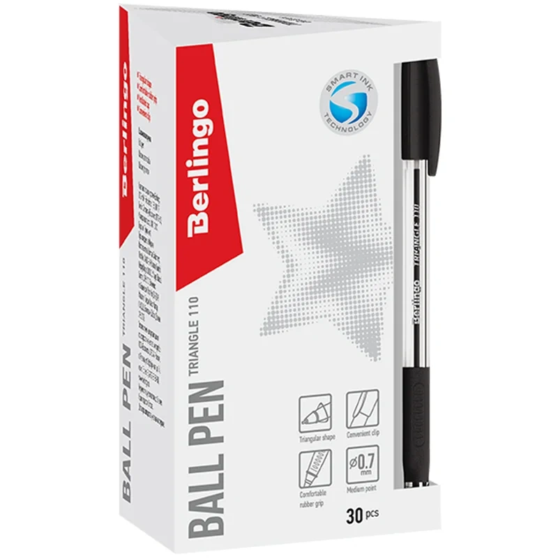 Одноразовая шариковая ручка Berlingo Triangle 110 с колпачком и пластиковым клипом станет надёжным помощником для учёбы или работы. Корпус ручки имеет эргономичную трёхгранную форму. Вентилируемый колпачок обеспечивает безопасность при использовании детьми. Эргономичная форма резинового упора для пальцев предотвращает усталость и скольжение пальцев при письме. Цвет деталей соответствует цвету чернил. Диаметр пишущего узла составляет 0,7 мм, благодаря чему ручка прекрасно подходит для любого стиля письма.Уникальная запатентованная технология Smart Ink – это лёгкое и приятное письмо за счёт использования чернил пониженной вязкости, специальной конструкции и особых материалов шарика пишущего узла. Такими чернилами можно писать без дополнительных усилий даже при лёгком касании бумаги. Инновационные компоненты, используемые для изготовления шарика пишущего узла (карбид вольфрама), обеспечивают долговечность и стабильность качества письма.- Технология Smart Ink;- Цвет чернил: чёрный;- Толщина линии письма: 0,5 мм;- Длина письма: 1000 м;- Цвет корпуса: прозрачный;- Количество штук в упаковке: 30;- Тип упаковки: картонная коробка