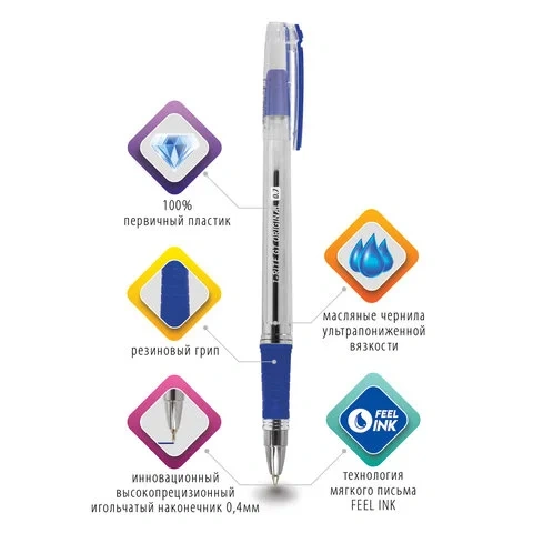 Модель изготовлена из высококачественных материалов. Сменный стержень длиной 140 мм. Удобная прорезиненная зона захвата. Специальная технология 'FEEL INK' гарантирует лёгкое и четкое письмо без каких-либо усилий. Диаметр пишущего узла 0,7 мм создает ровную линию письма, равную 0,35 мм. Прозрачный цвет корпуса с синими деталями.